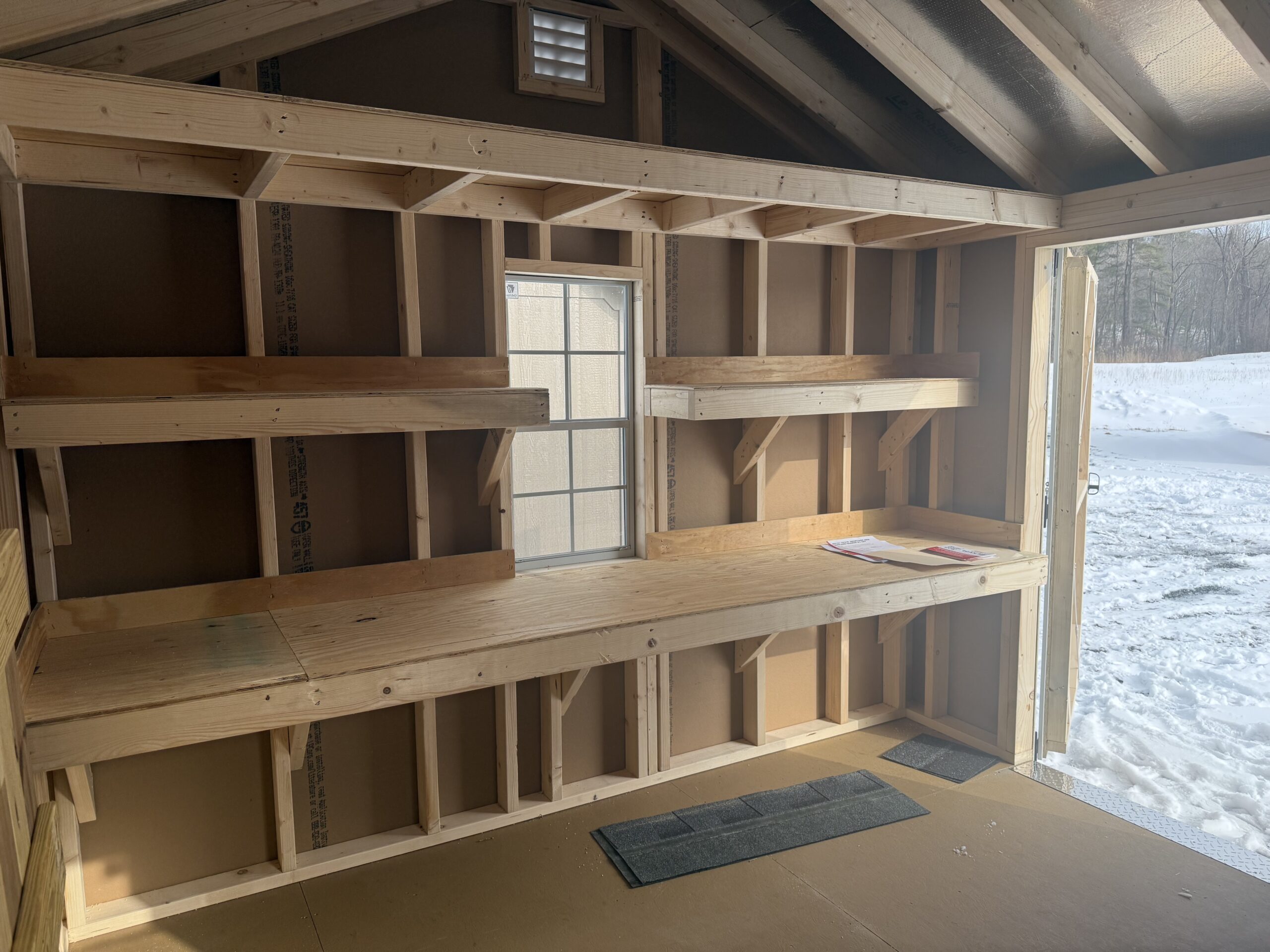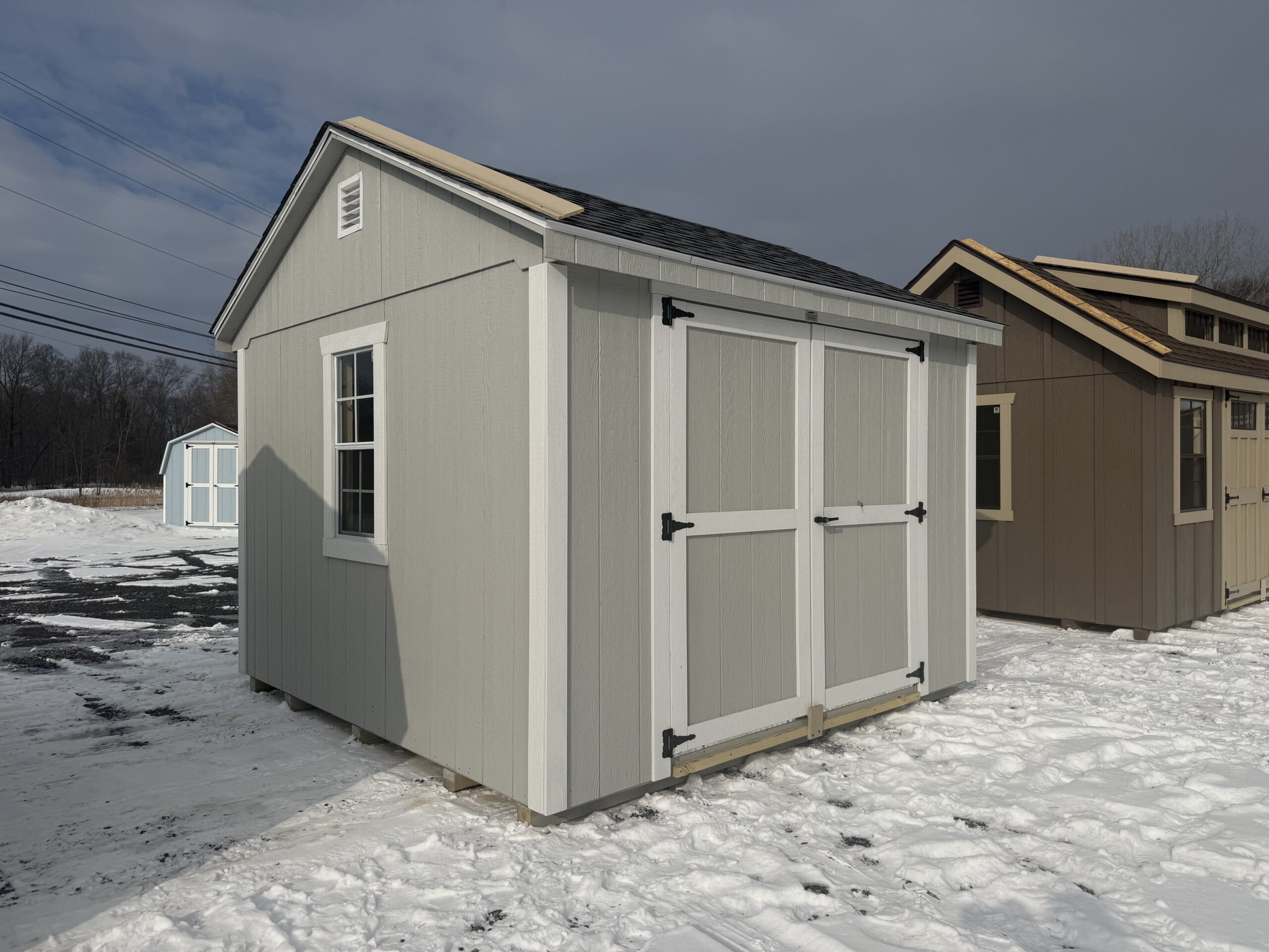 10x10 Smartside Cottage w/ 6'2" sidewalls, 6' double door, P.T. ramp & diamond plate, workbench package w/ 2' loft, 2-18"x36" window w/ screen, 2 gable air vents, 3.5" miratec trim, 5/8" T&G PerformMax flooring