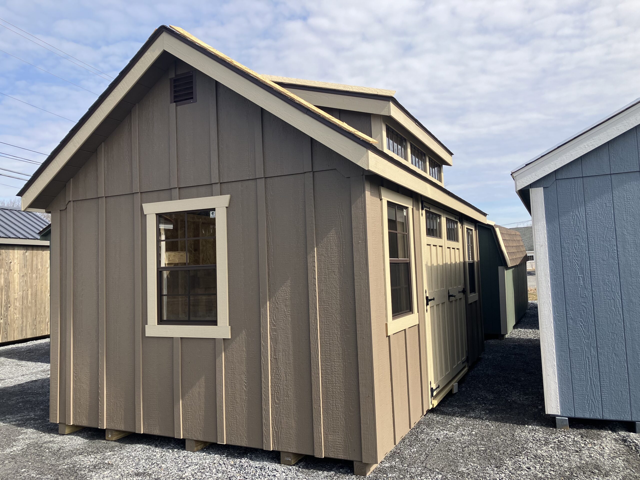 10x16 New England Cottage w/ 6'2" sidewalls, 6' double doors w/ transom glass, diamond plate & P.T. ramp, workbench package, 3-24"x36" windows w/ screen, 8' shedrow dormer, 8" gable overhangs, 2 gable air vents, steep roof pitch, 1"x6" miratec rake and face, 3.5" miratec trim, 5/8" PerformMax flooring