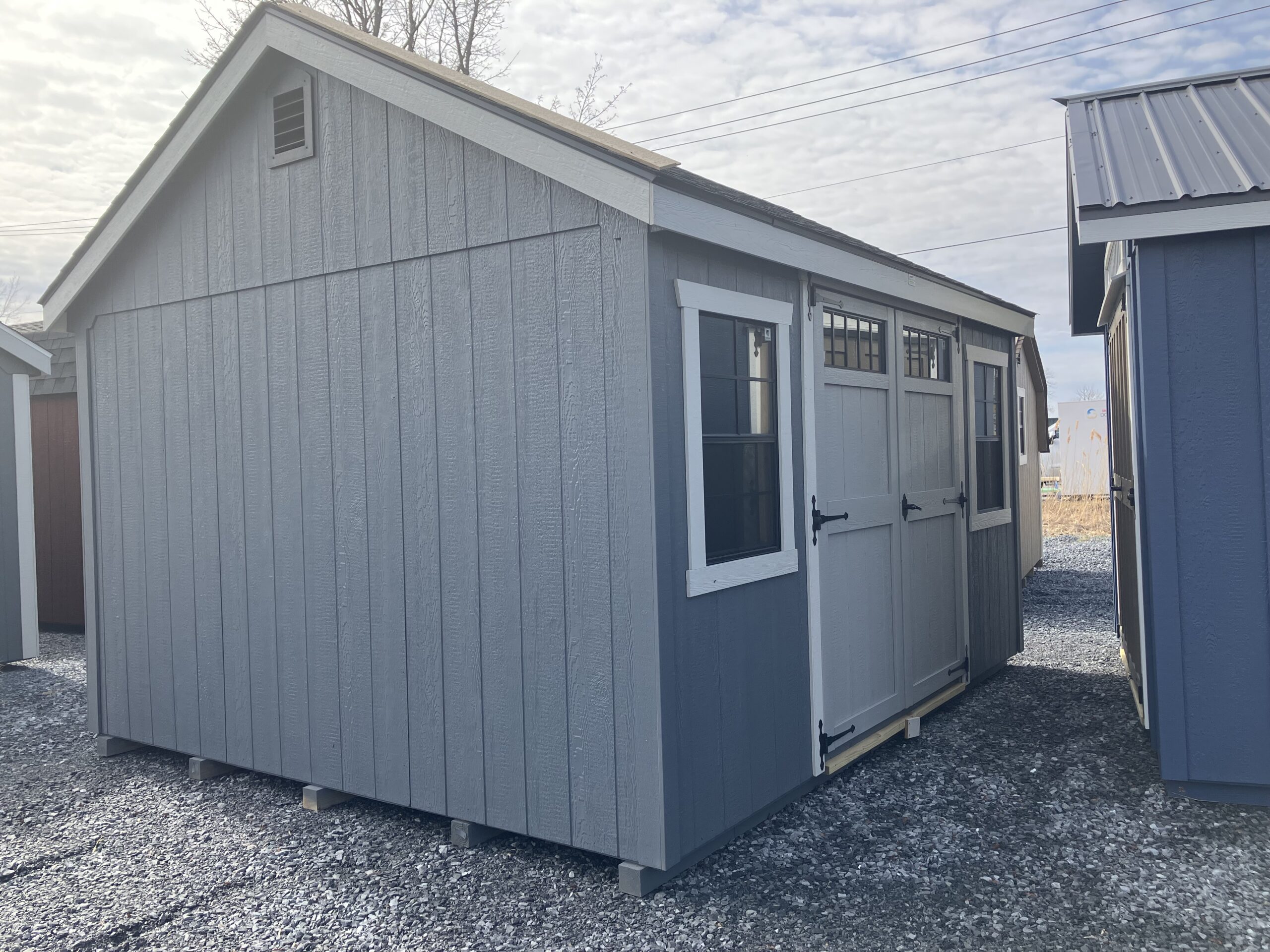 12'x14' Cottage, 7' sidewalls, 6' double door w/ transom glass, diamond plate & p.t. ramp, 3' loft, 2-24"x36" window w/ screen, gable air vents, 3.5" miratec trim, 5/8" T&G PerformMax flooring