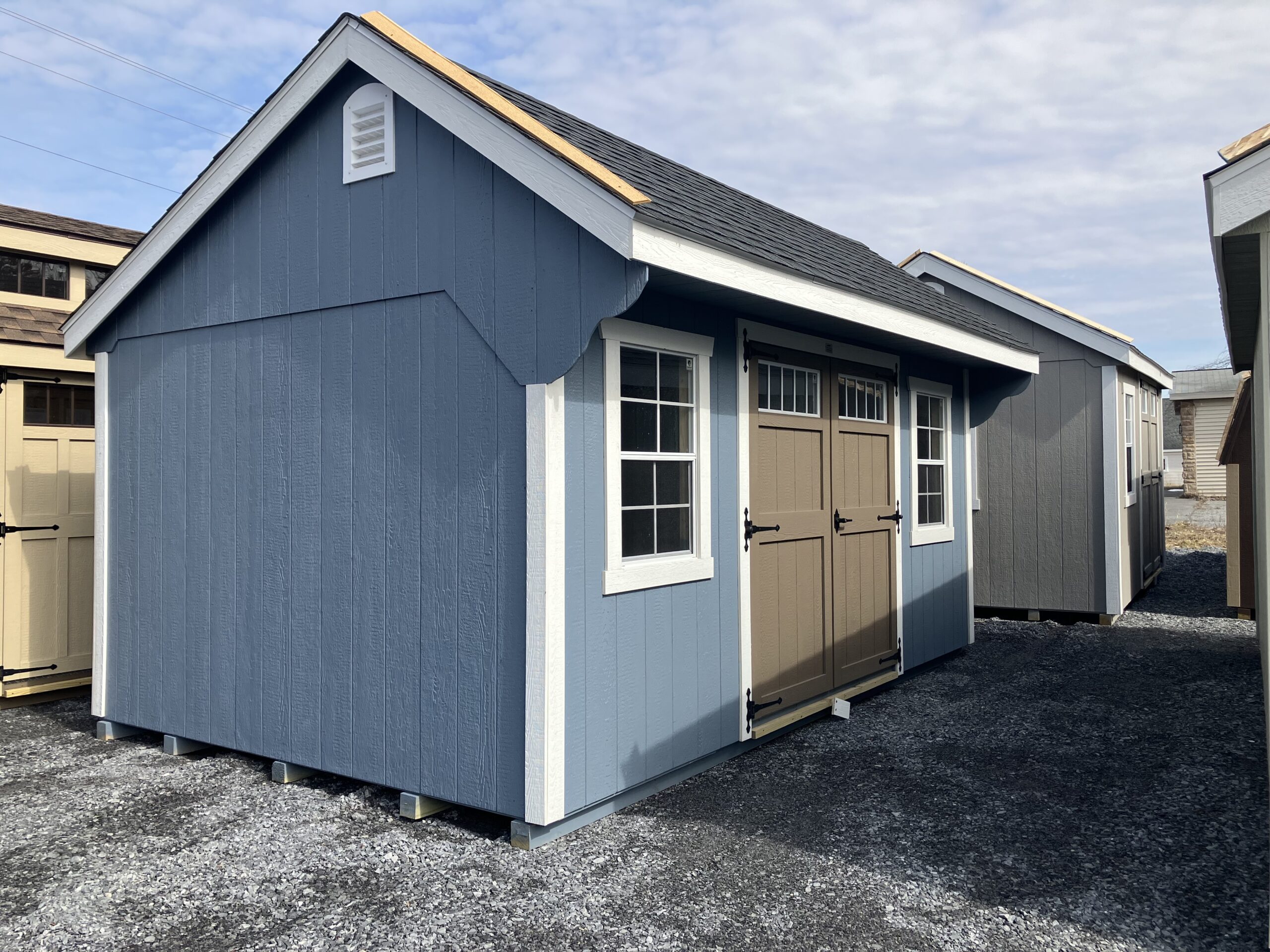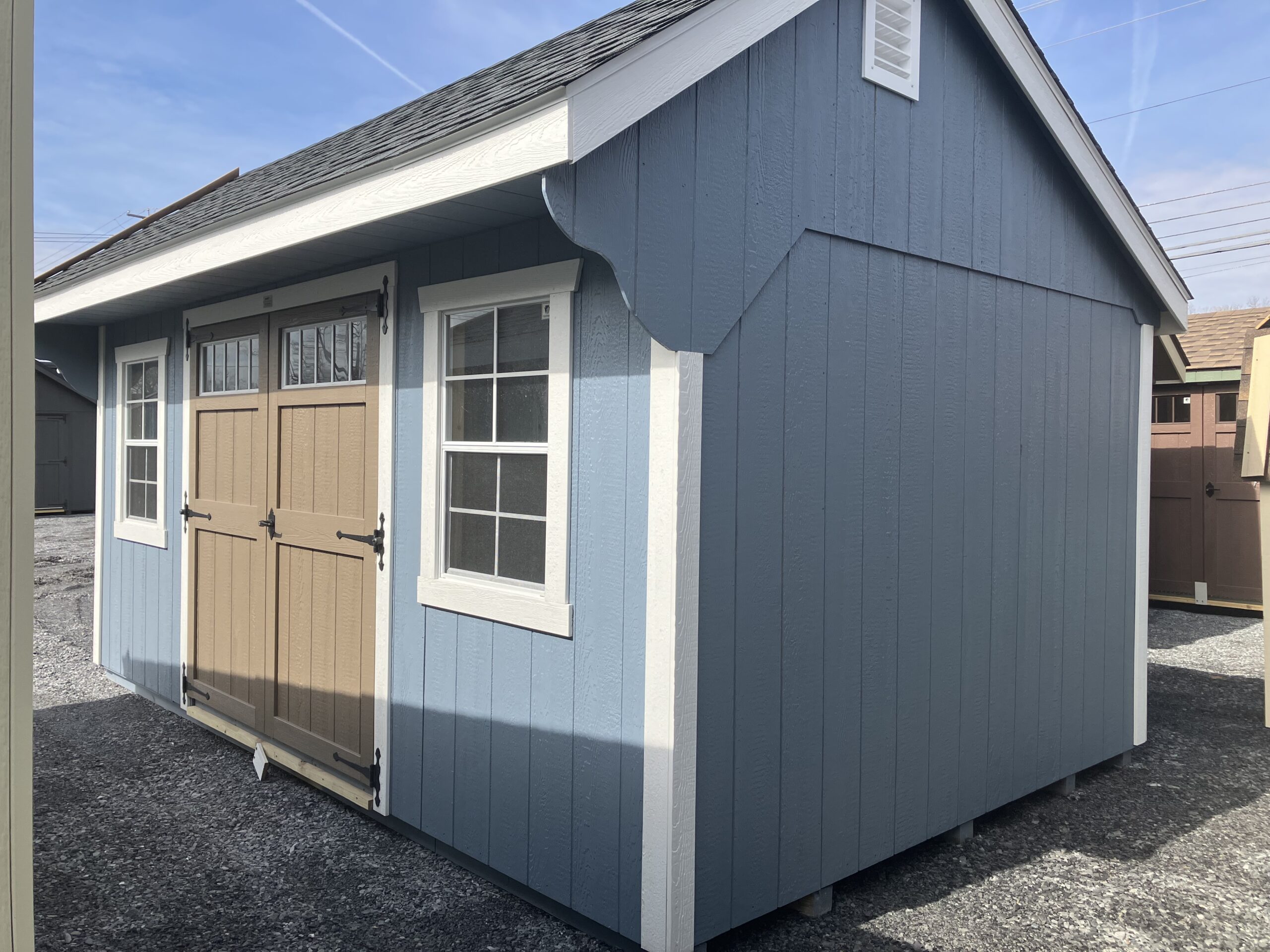 10' x 16' Smartside Quaker, 6' wide double door w/ transom, p.t. ramp and diamond plate, 2 - 24" x 36" windows with screens, 3.5" Miratec trim, 2- gable air vents, 5/8" Perform Max T&G flooring