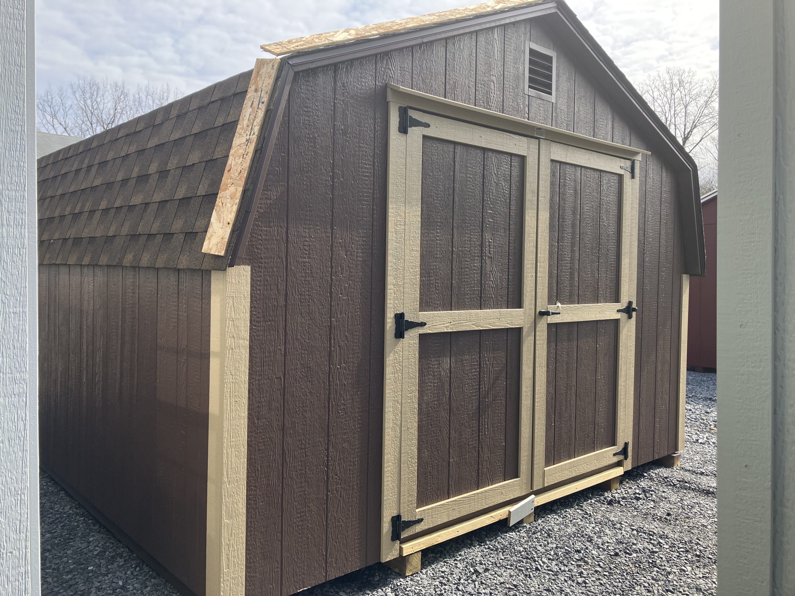 12' x 16' Mini Barn, 6' wide double door w/ diamond plate & P.T. ramp, 1-18"x27" window w/ screen, 1- gable vents, 3.5" miratec trim, 5/8" PerformMax T&G flooring