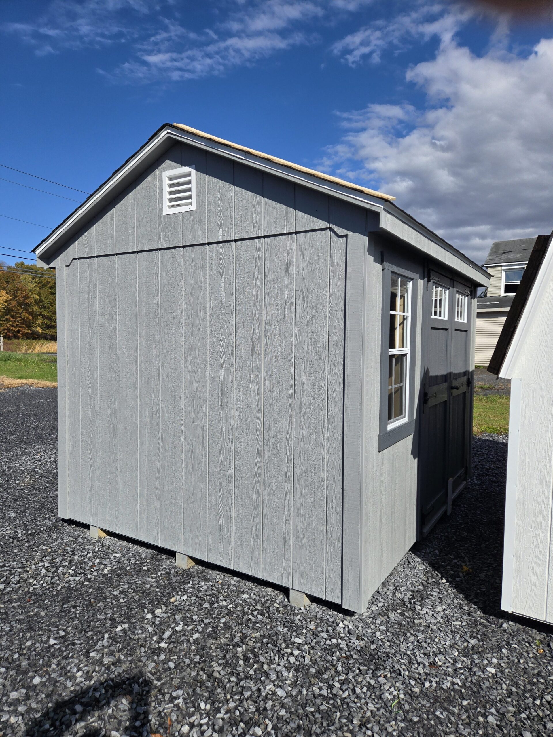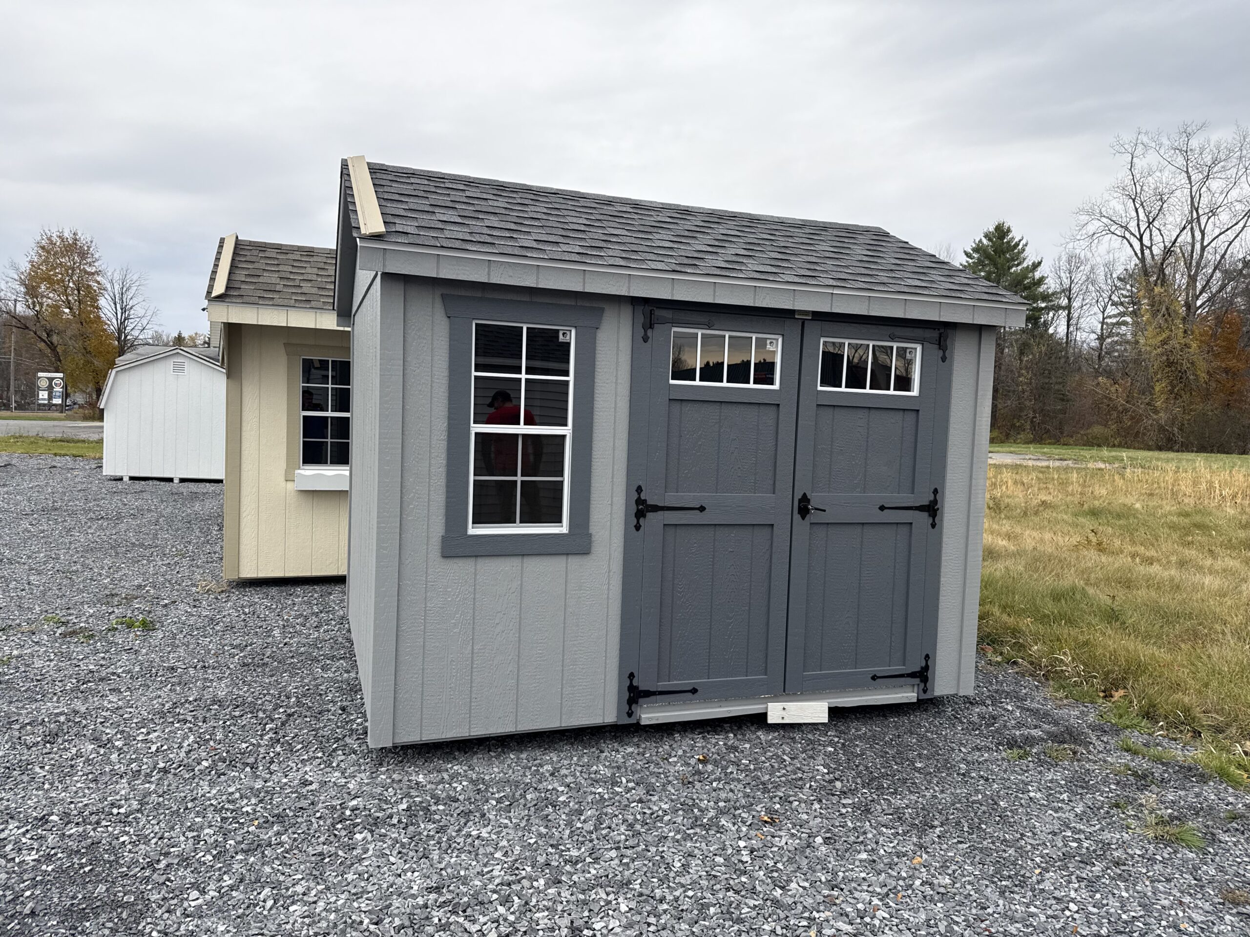 8x10 Cottage, 5' double door w/ diamond plate & p.t. ramp, 1-18"x36" window w/ screen, gable air vents, 3.5" miratec trim, 5/8" T&G PerformMax flooring