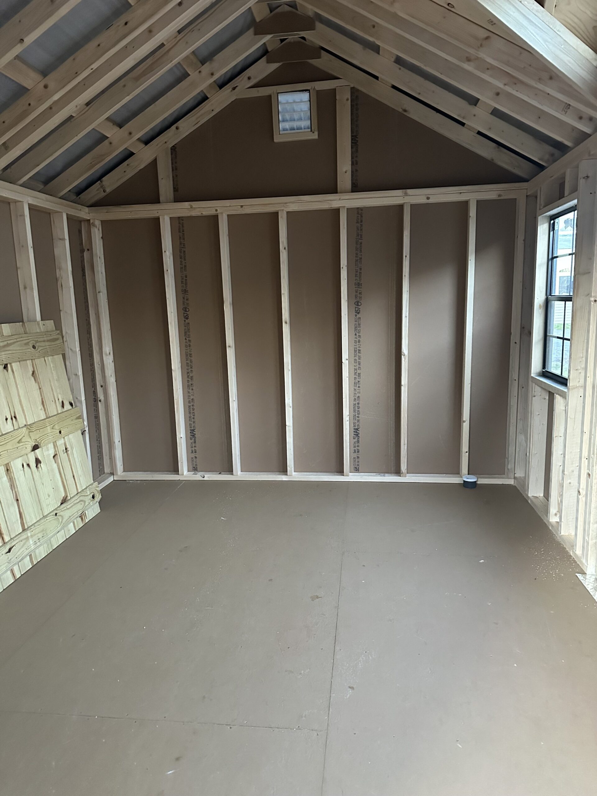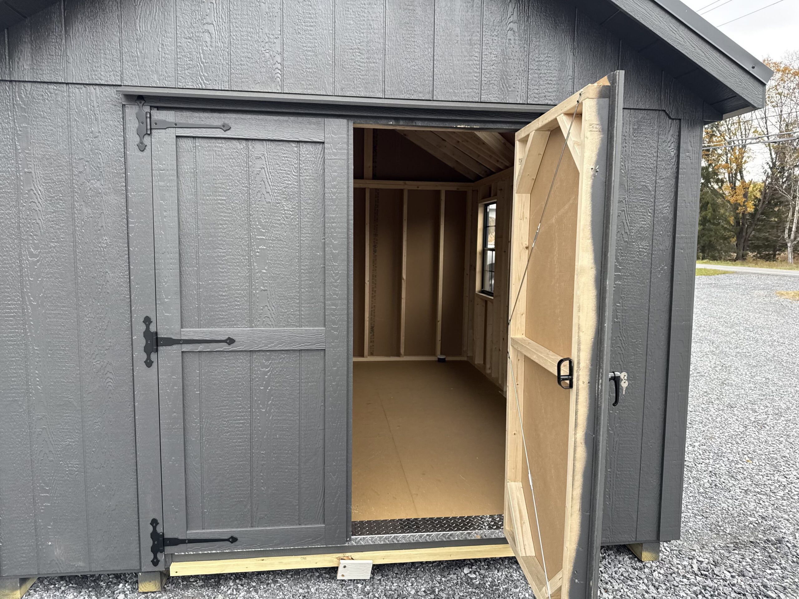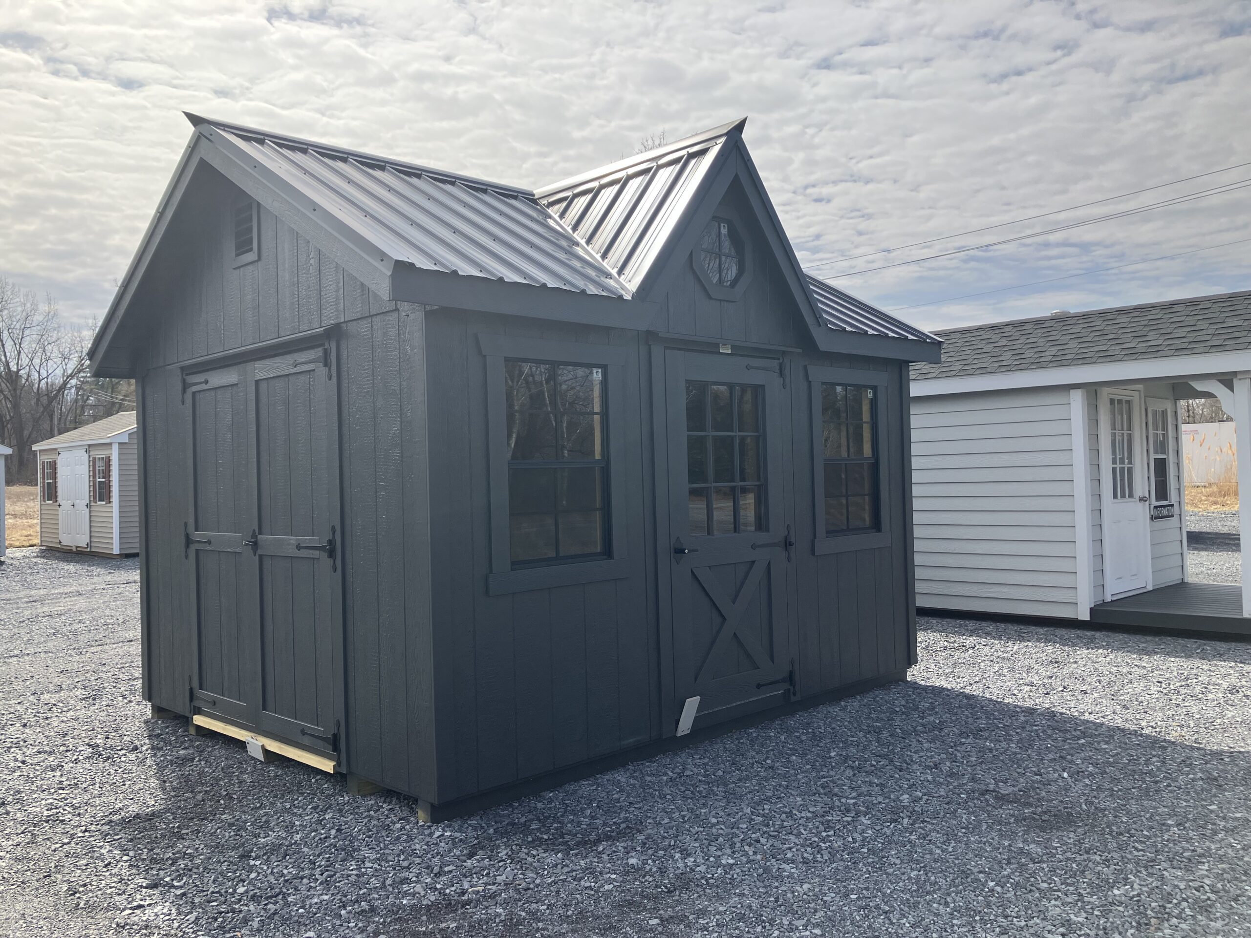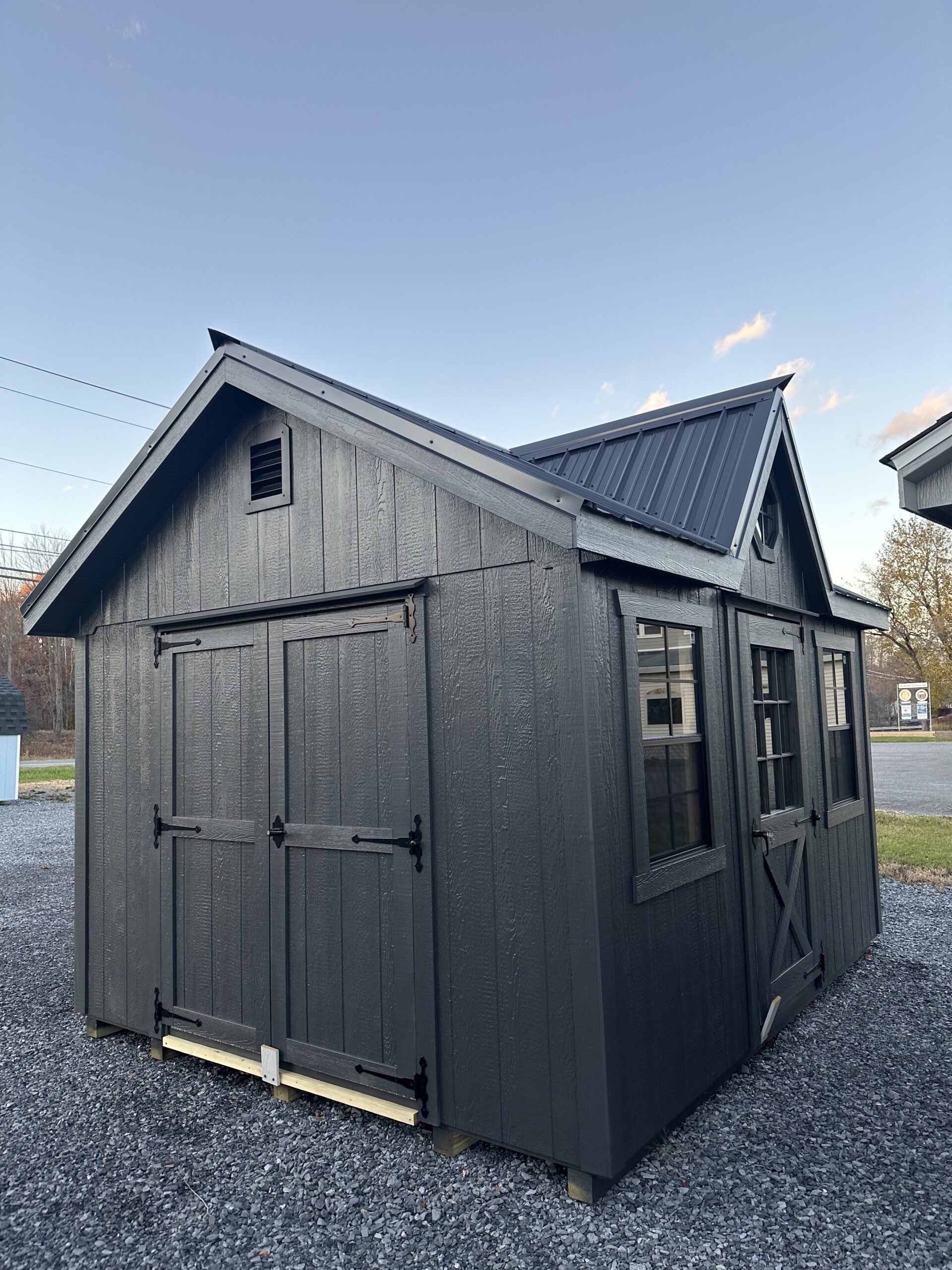 10x12 NE Cottage w/ 4' gable dormer, 6'2" sidewalls, 5' double doors w/ p.t. ramp & diamond plate, 3' entry door with 9 lite, 2-24"x36" windows w/ screen, 2 gable air vents, 2 gable overhangs, metal roof, steep roof pitch, 1"x6" miratec rake and face, 3.5" miratec trim, 5/8" PerformMax flooring