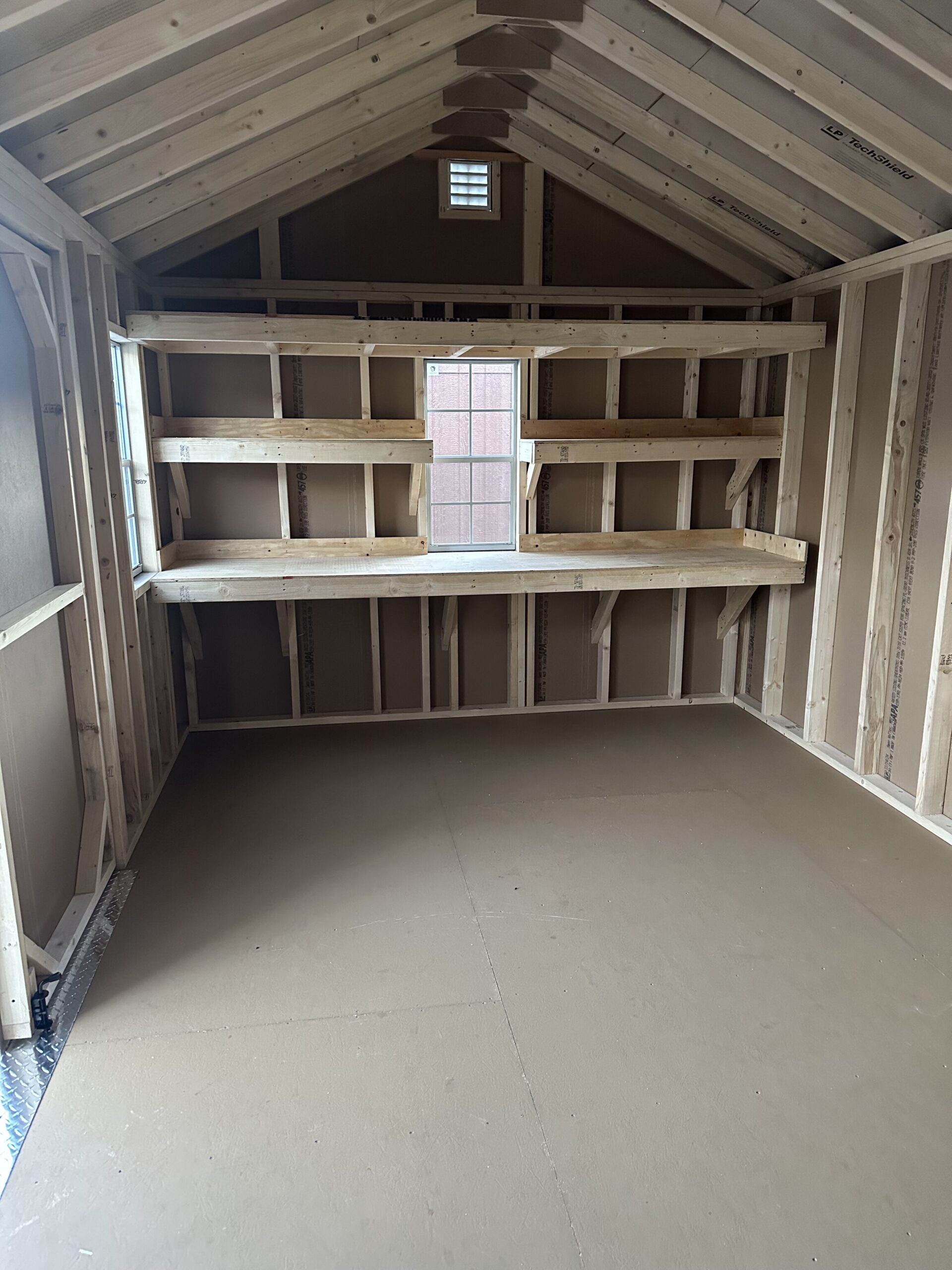 10' x 16' Smartside Cottage, 6' wide double doors, diamond plate and pressure treated ramp, 3 - 18"x36" windows w/ screens, 10' workbench package with 2' loft, 2 gable air vents, 3.5" miratec trim, 5/8" T&G PerformMax flooring