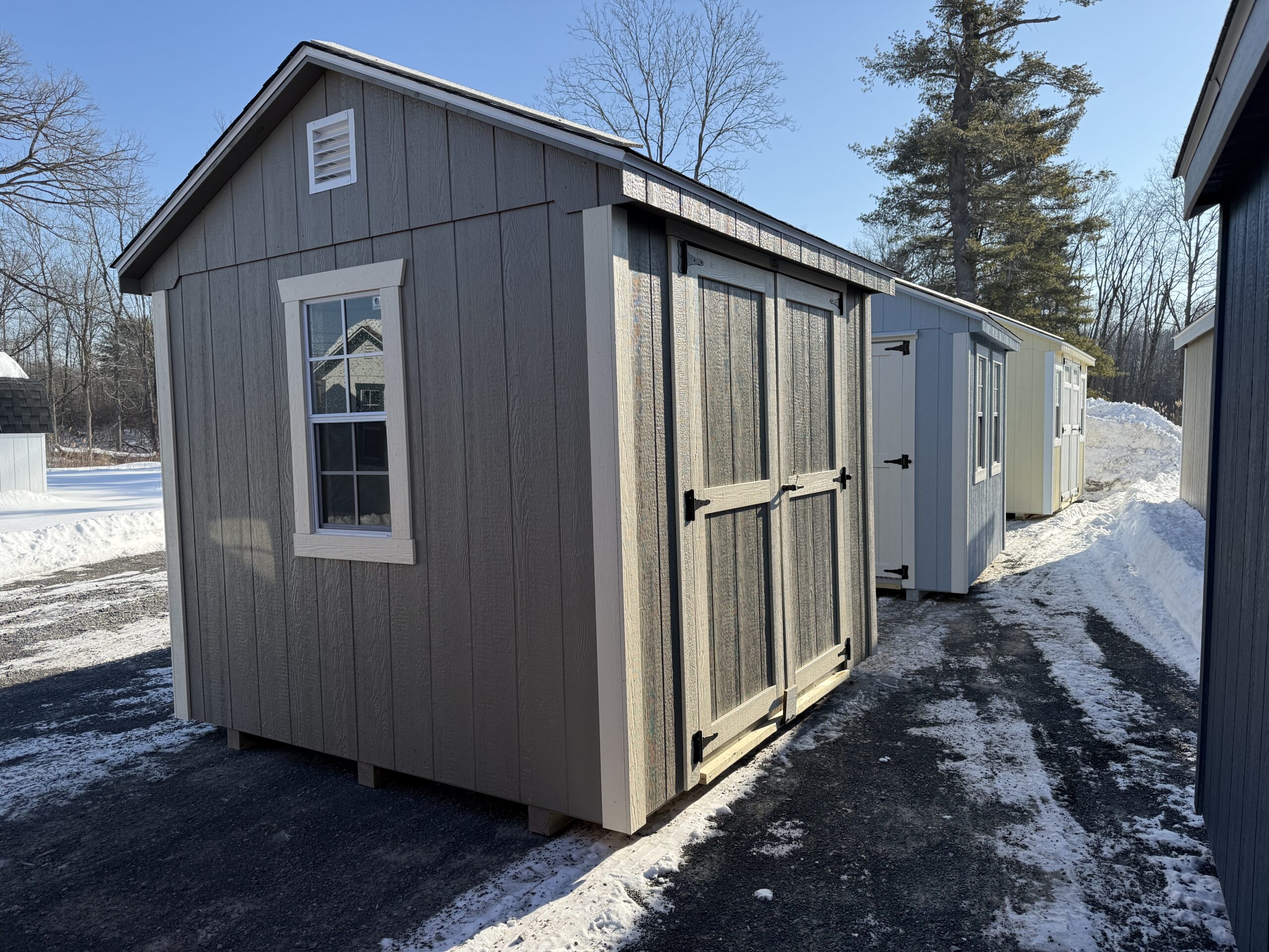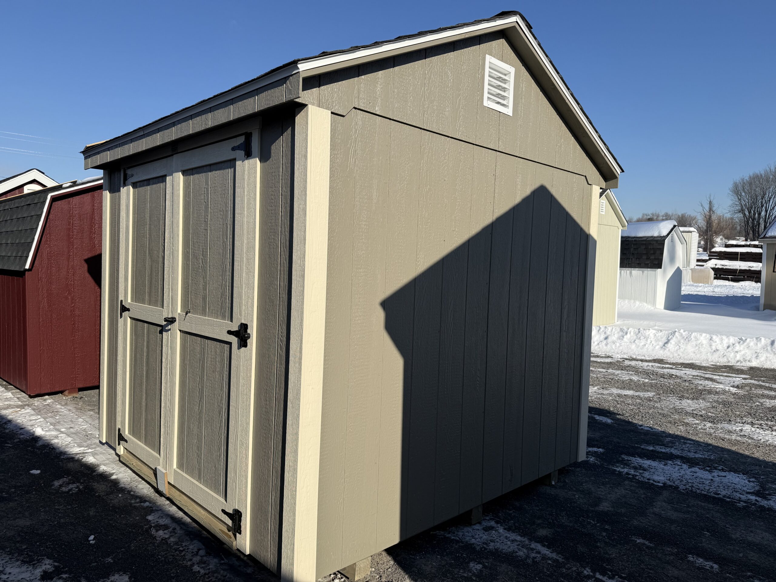 8x8 cottage w/ 6'2" sidewalls, 5' double door w/ diamond plate & p.t. ramp, 1-18"x36" window w/ screen, gable air vents, 3.5" mitatec trim, 5/8" T&G PerformMax flooring