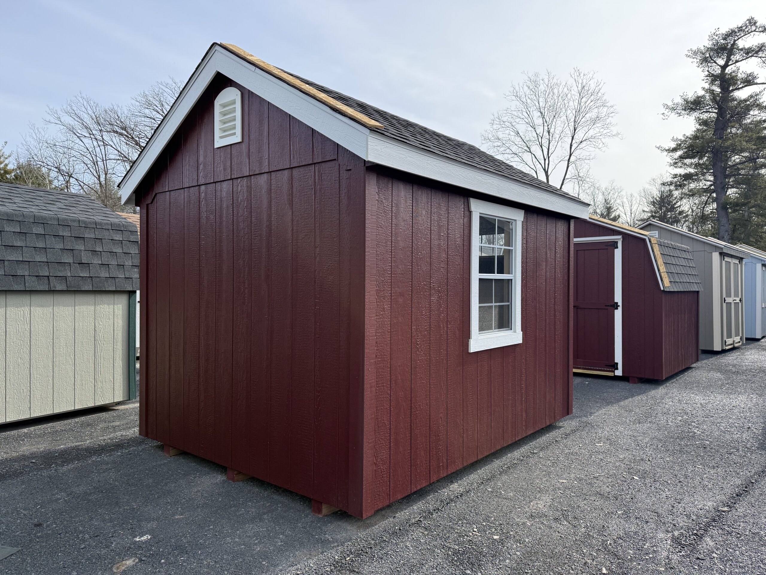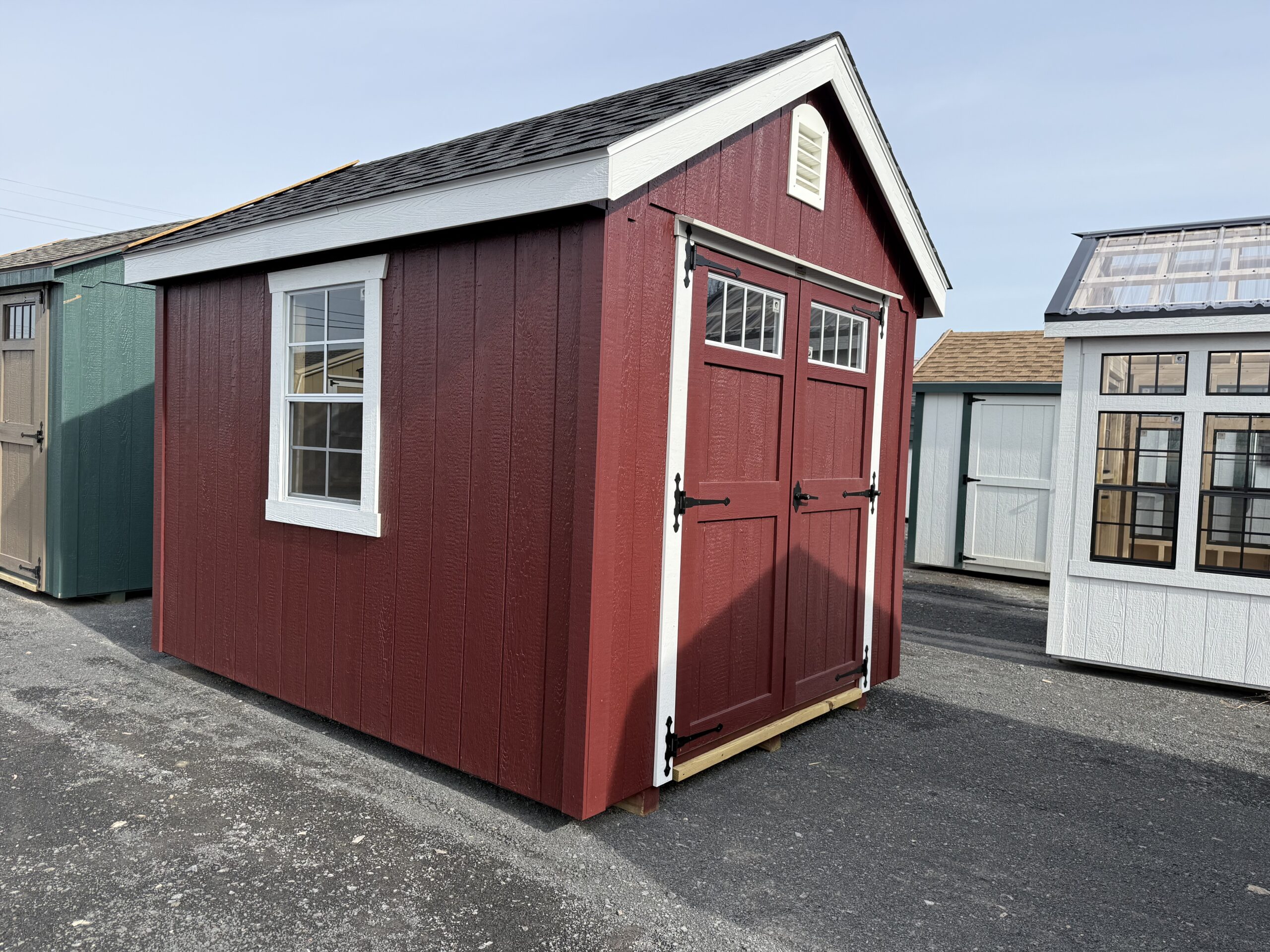 8x10 Cottage, 6'2" sidewalls, 5' double door w/ transom glass, diamond plate & p.t. ramp, workbench package, 1-24"x36" window w/ screen, gable air vents, 3.5" miratec trim, 5/8" T&G PerformMax flooring