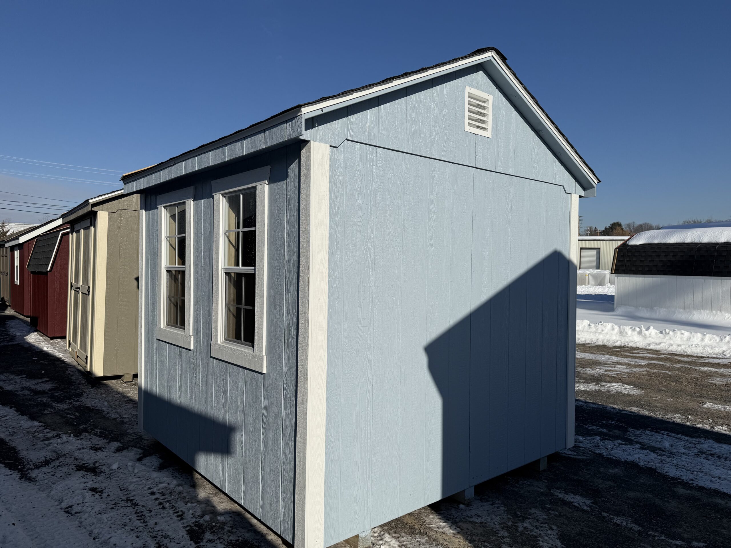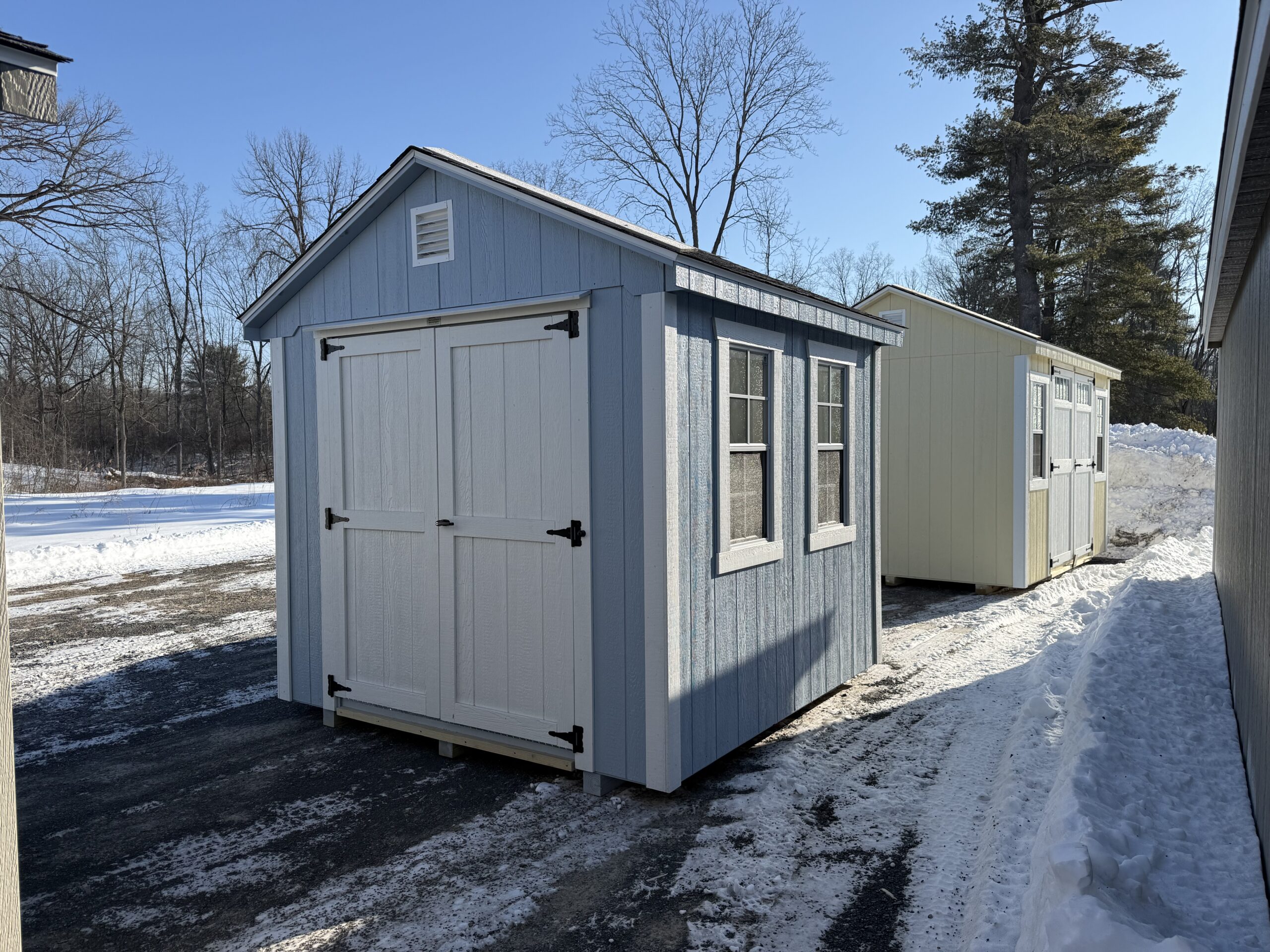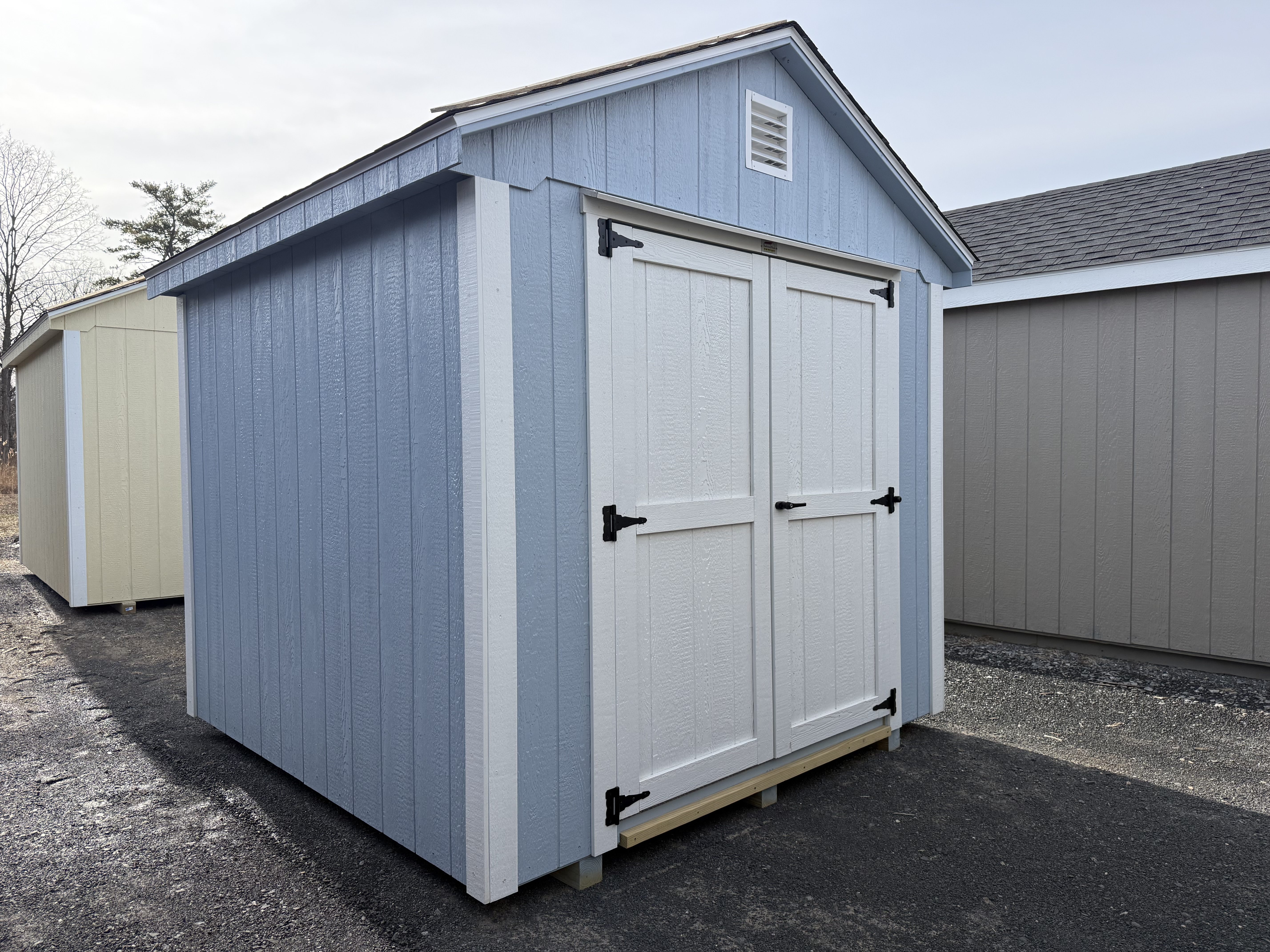 8x8 cottage w/ 6'2" sidewalls, 5' double door w/ diamond plate & p.t. ramp, 2' loft, 2-18"x36" window w/ screen, gable air vents, 3.5" mitatec trim, 5/8" T&G PerformMax flooring