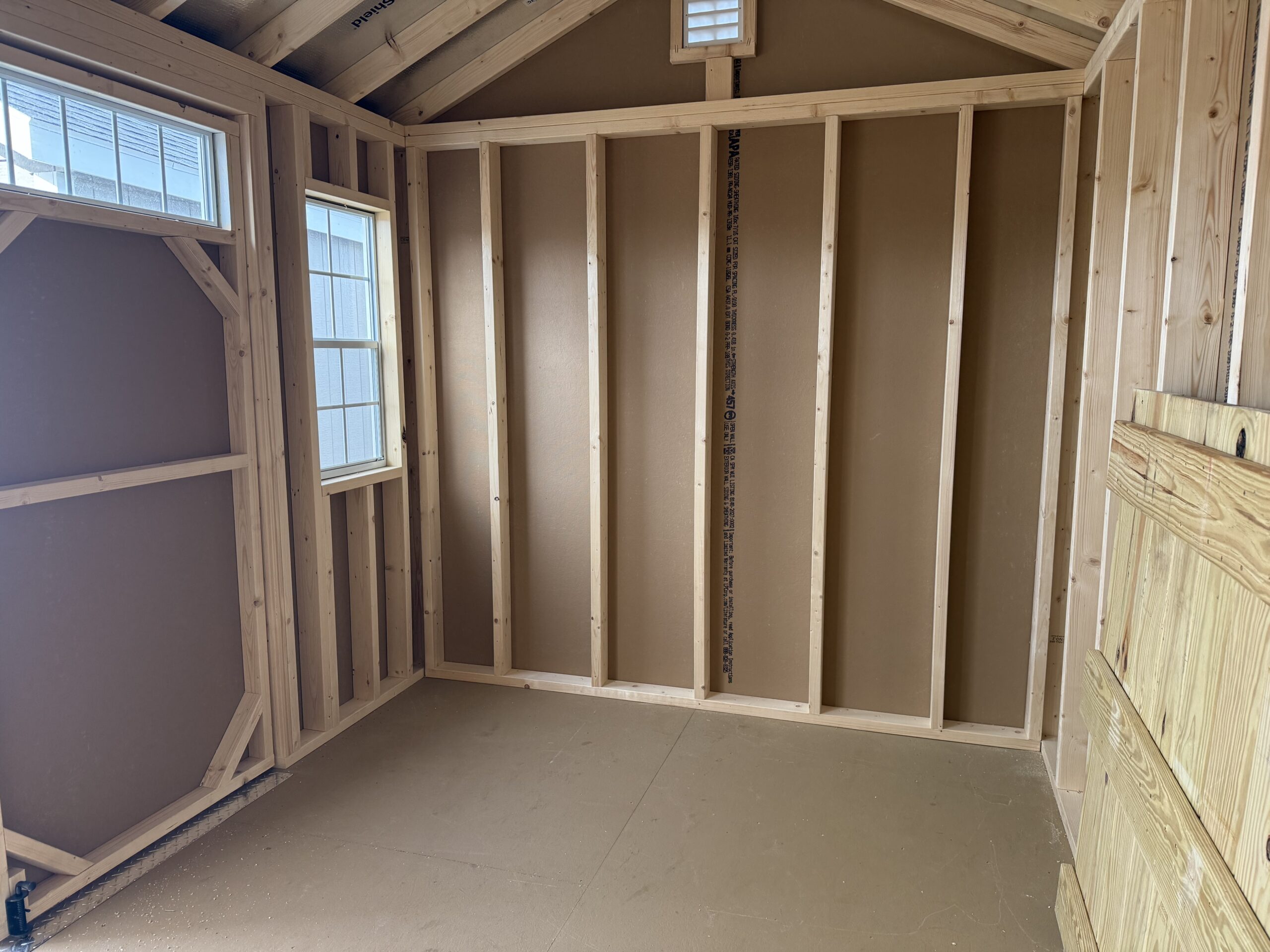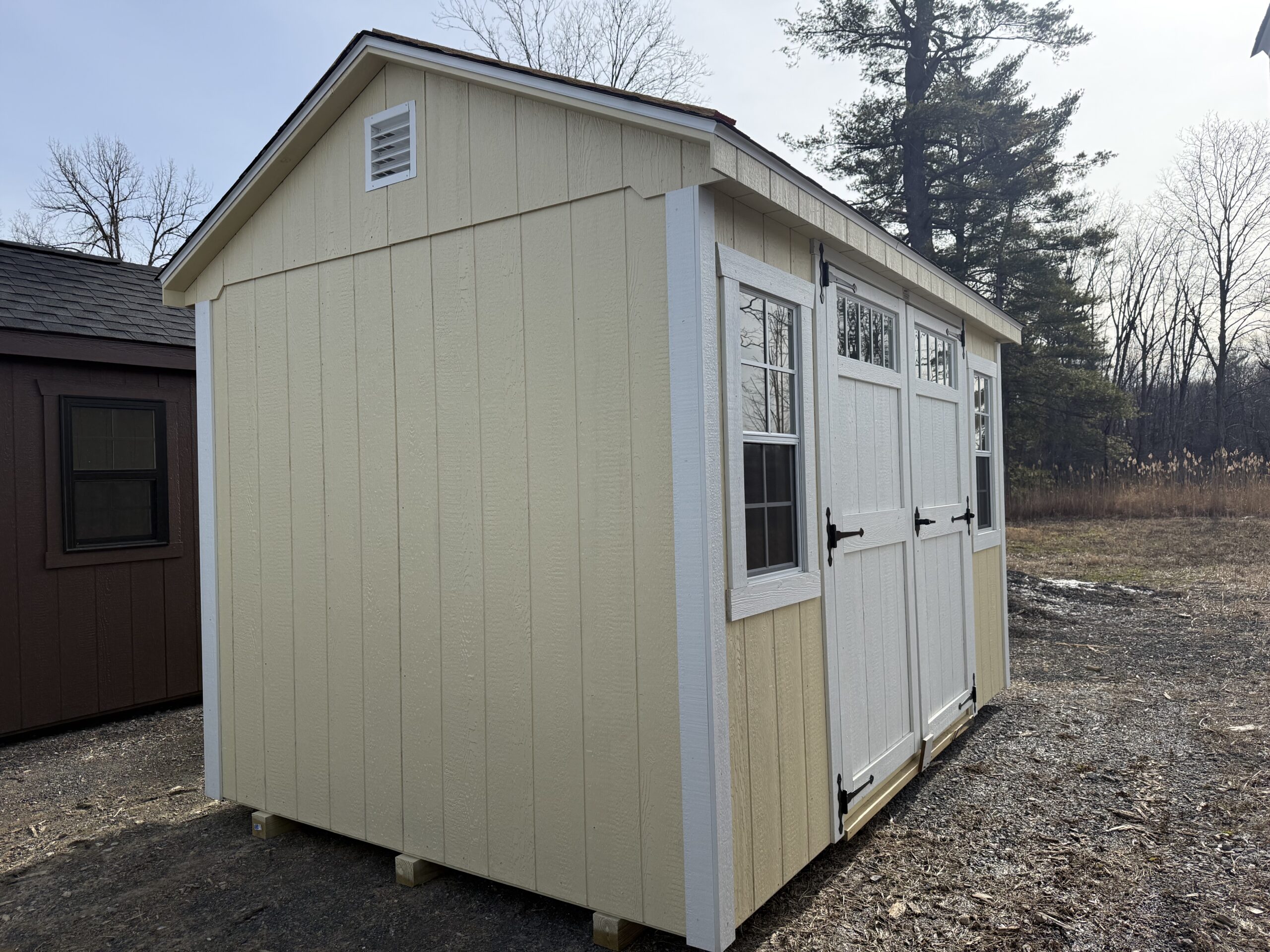 8' x 12' Smartside 7' Cottage, 6' wide double doors with transom glass, diamond plate and pressure treated ramp, 2 - 18"x36" windows w/ screens, 2 gable air vents, 3.5" miratec trim, 5/8" T&G PerformMax flooring