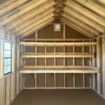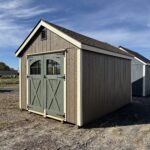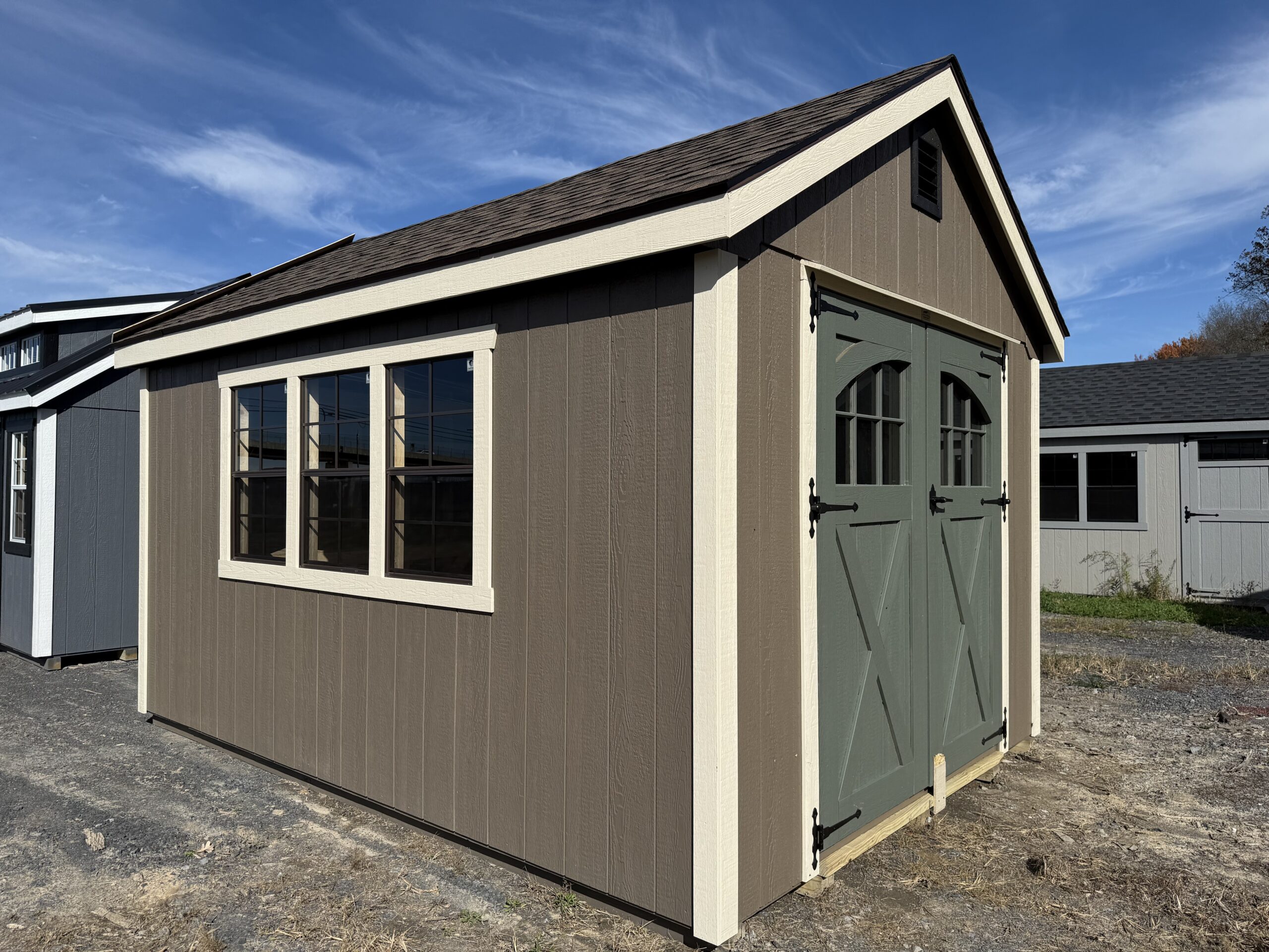 10x14 New England Cottage w/ 7' sidewalls, 6' double-6 lite carriage doors w/ diamond plate & P.T. ramp, 3-24"x36" windows w/ screen, 10' workbench package, 2 gable air vents, steep roof pitch, 1"x6" miratec rake and face, 3.5" miratec trim, 5/8" PerformMax flooring