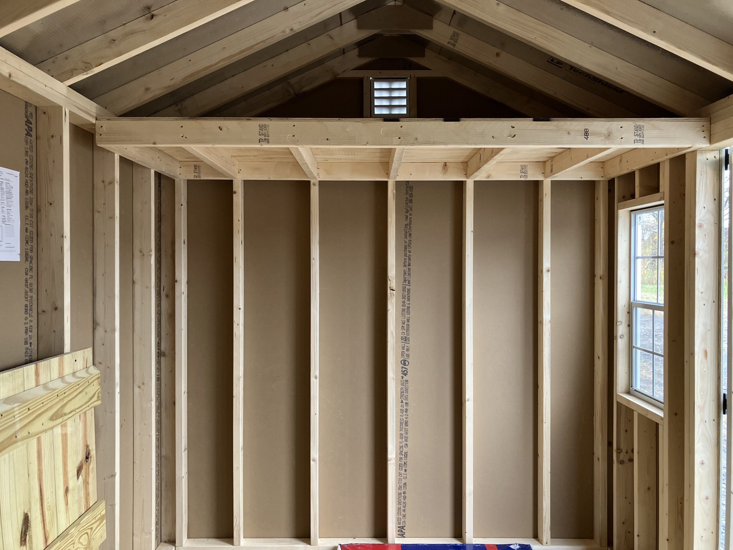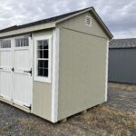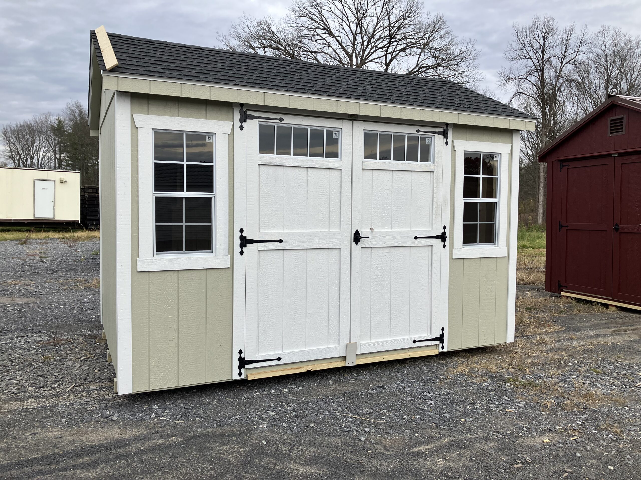 8x12 Smartside Cottage w/ 7' sidewalls, 6' double doors w/ transom glass, diamond plate & P.T. ramp, 2-18"x36" windows w/ screen, 2 gable air vents, 3' loft, steep roof pitch, 1"x6" miratec rake and face, 3.5" miratec trim, 5/8" PerformMax flooring