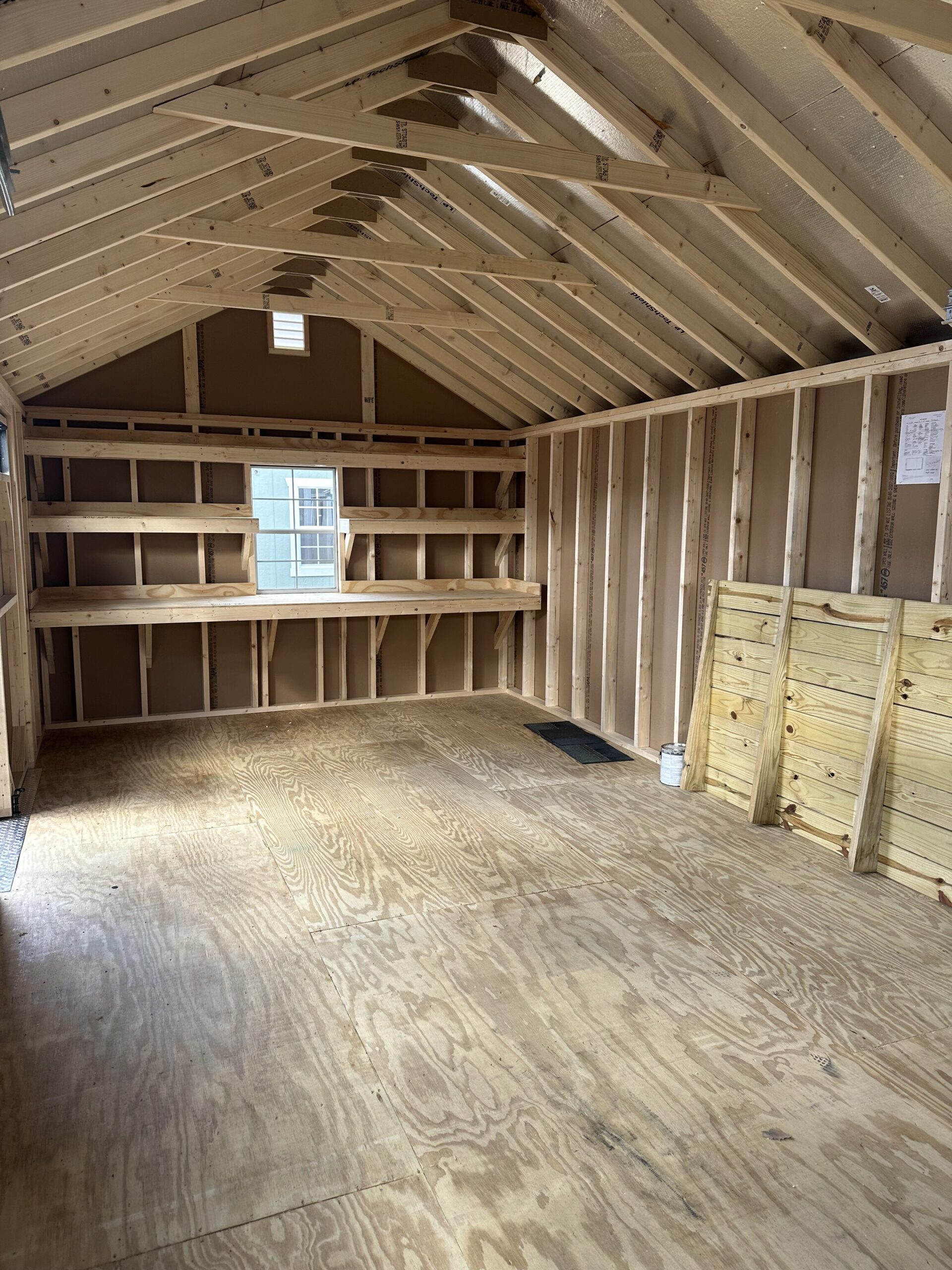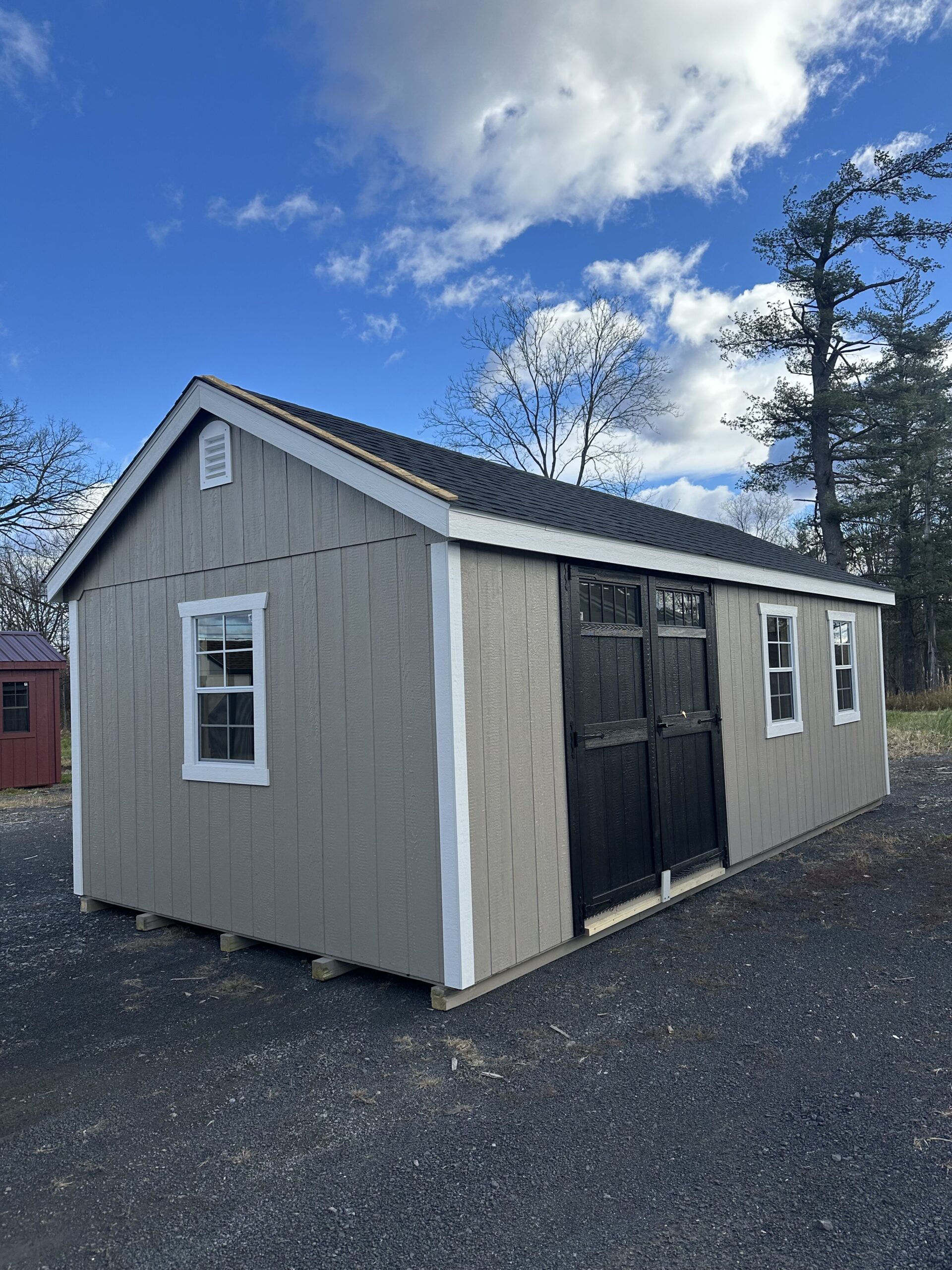 12'x24' Preferred garage with 7'H sidewalls, 9x7 carriage garage door with Stockbridge Long glass, diamond plate & P.T. ramp, 12' workbench package, 3-24"x36" windows, double doors with transom glass, 10" gable overhang above garage door, full rake and fascia trim, 6/12 roof pitch, 3/4" pressure treated floor with P.T. floor joist 12" on center