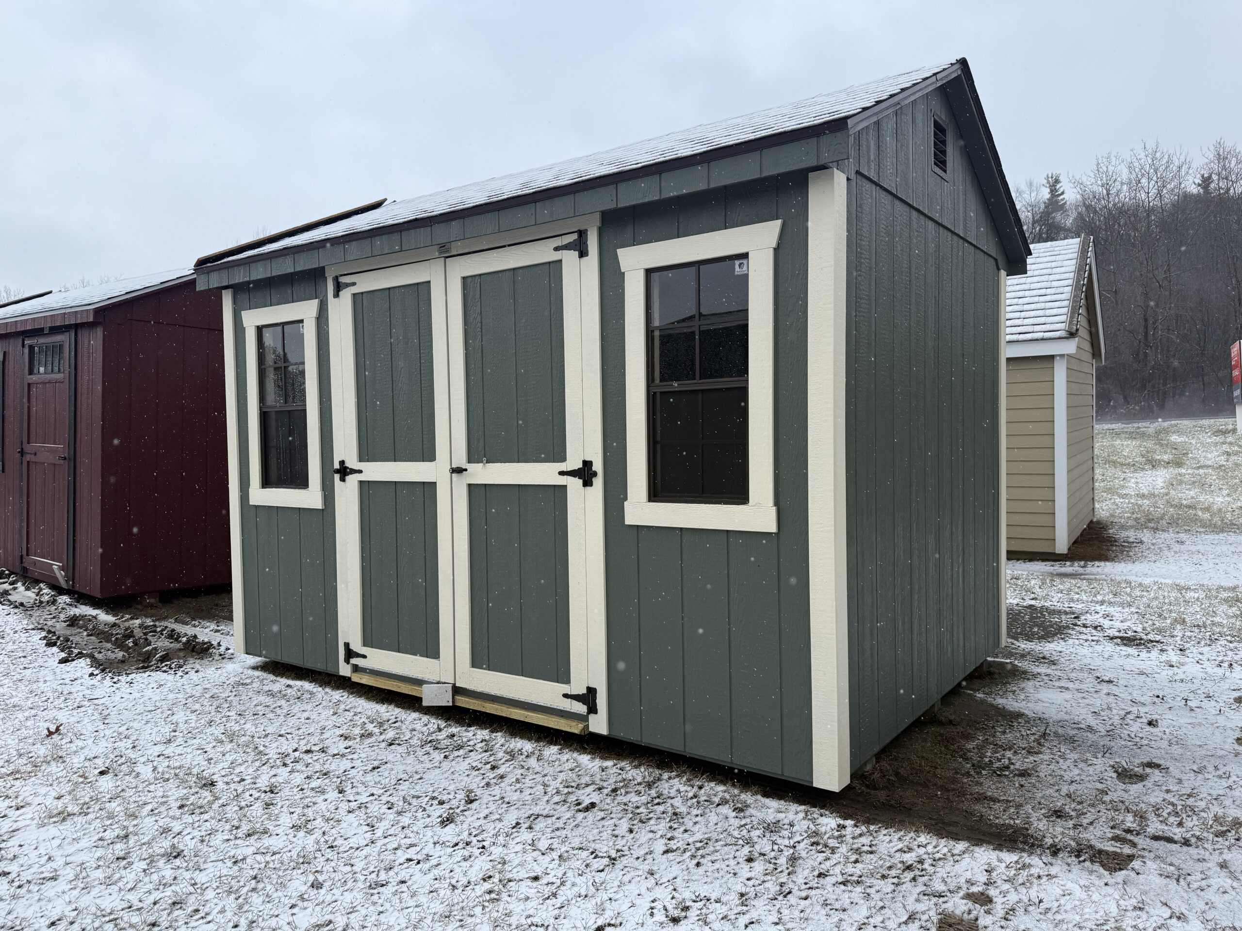 8' x 12' Smartside 7' Cottage, 6' wide double doors, diamond plate and pressure treated ramp, 3' loft, 2 - 18"x36" windows w/ screens, 2 gable air vents, 3.5" miratec trim, 5/8" T&G PerformMax flooring
