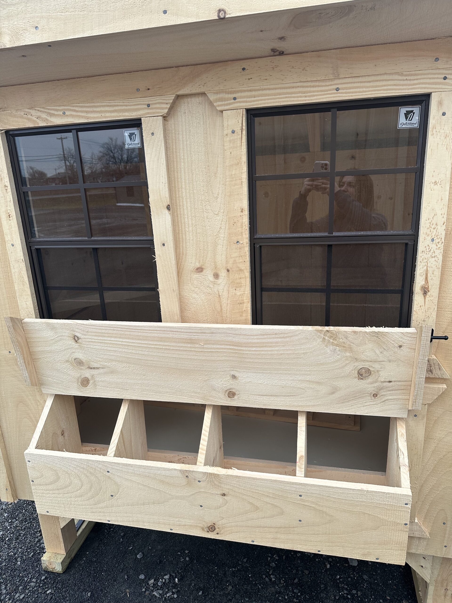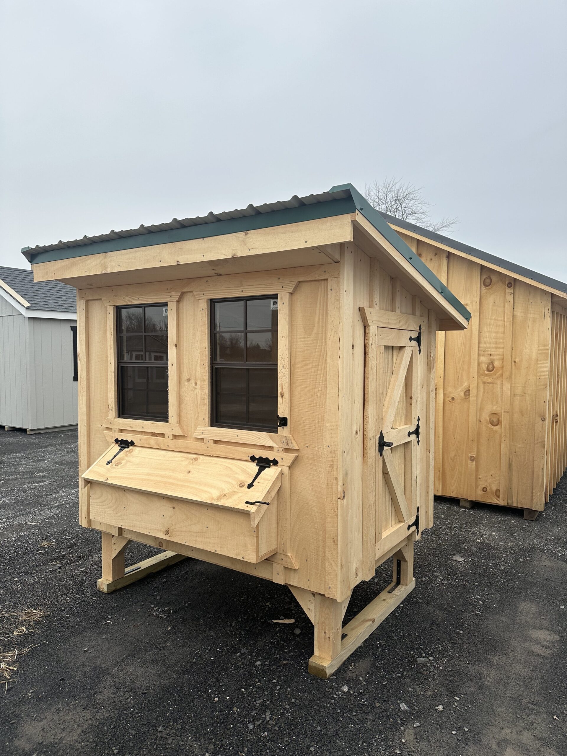 4'x6' chicken coop, 4 nesting boxes, glass board floors, roost, entry door, chicken door w/ ramp, holds 10-12 chickens