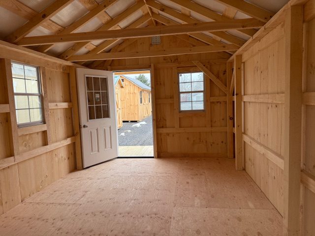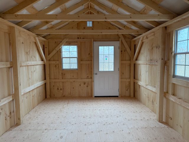 12' x 28' freshly milled white pine cottage, 12' x 24' interior with a 4' pressure treated plywood porch, 3' pre-hung house door, 4 - 24"x36" insulated windows w/ screens, 2 gable air vents, it is inherent nature of uncured freshly milled pine to shrink, split, check during aging process