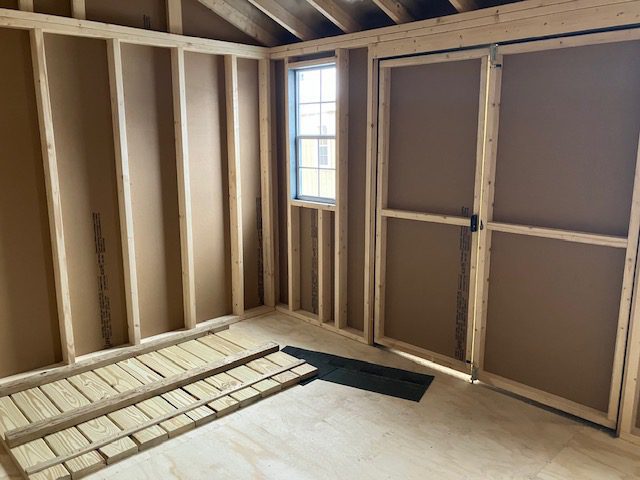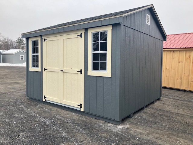 10x12 Smartside Cottage, 5' double door, P.T. ramp & diamond plate, workbench package, 2-18"x36" windows w/ screen, 2 gable air vents, 3.5" miratec trim, plywood flooring