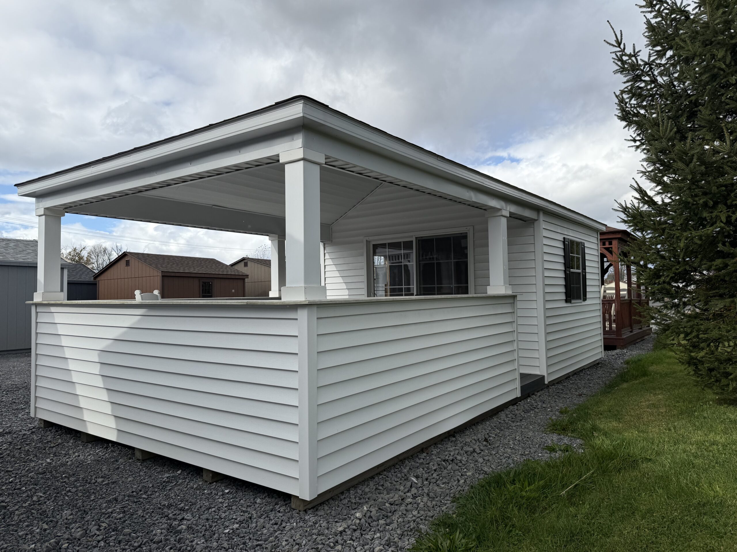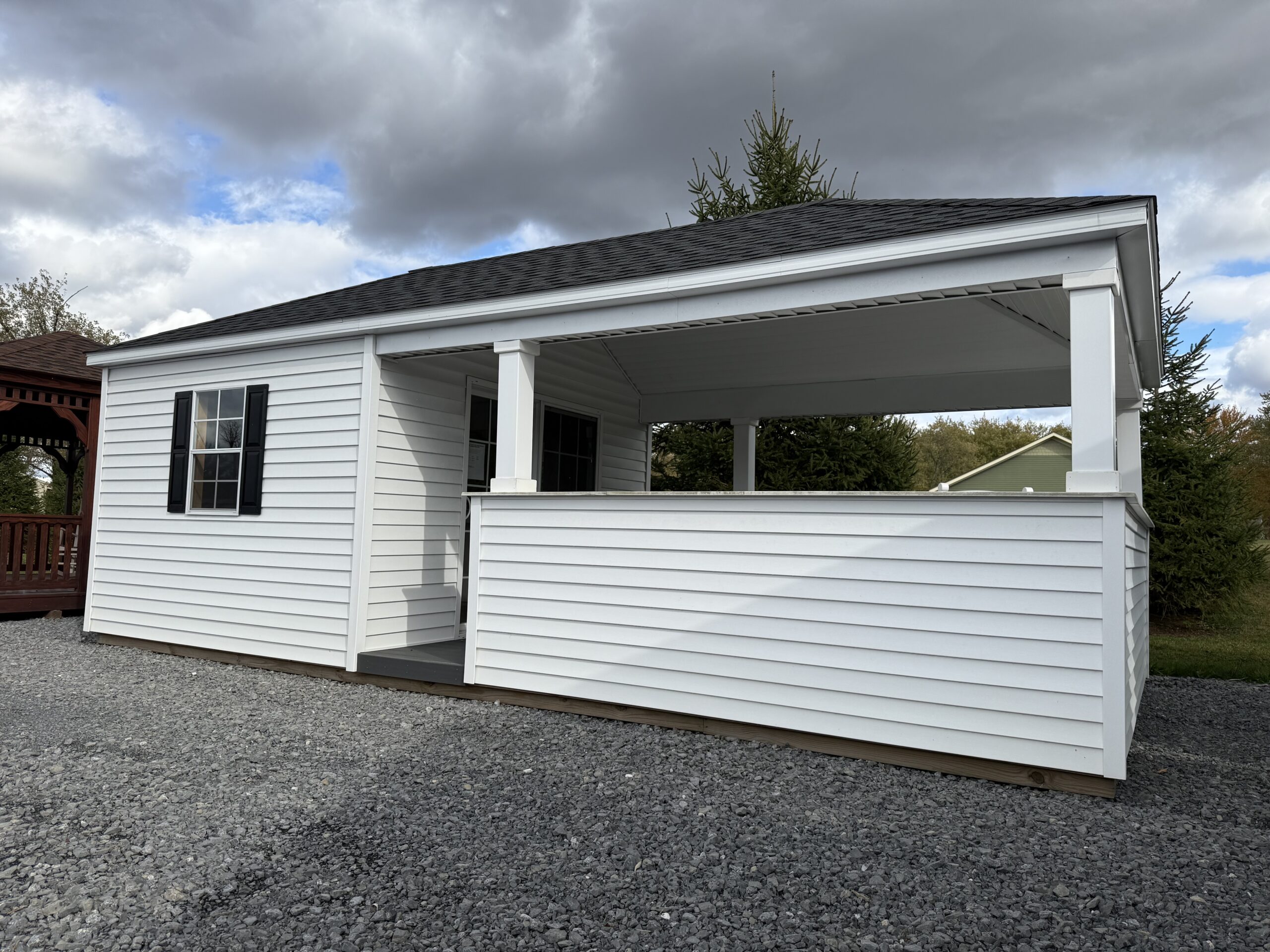 12x24 vinyl cottage w/ 7' sidewalls, hip roof, 12x10 interior, 6' sliding door w/ 15 lite glass, 2-24"x36" windows w/ screens, black raised panel shutters, 12x14 porch w/ grey composite decking, wrap around counter tops, 2-10" gable overhangs, 2 gable air vents, 5/8" T&G PerformMax flooring