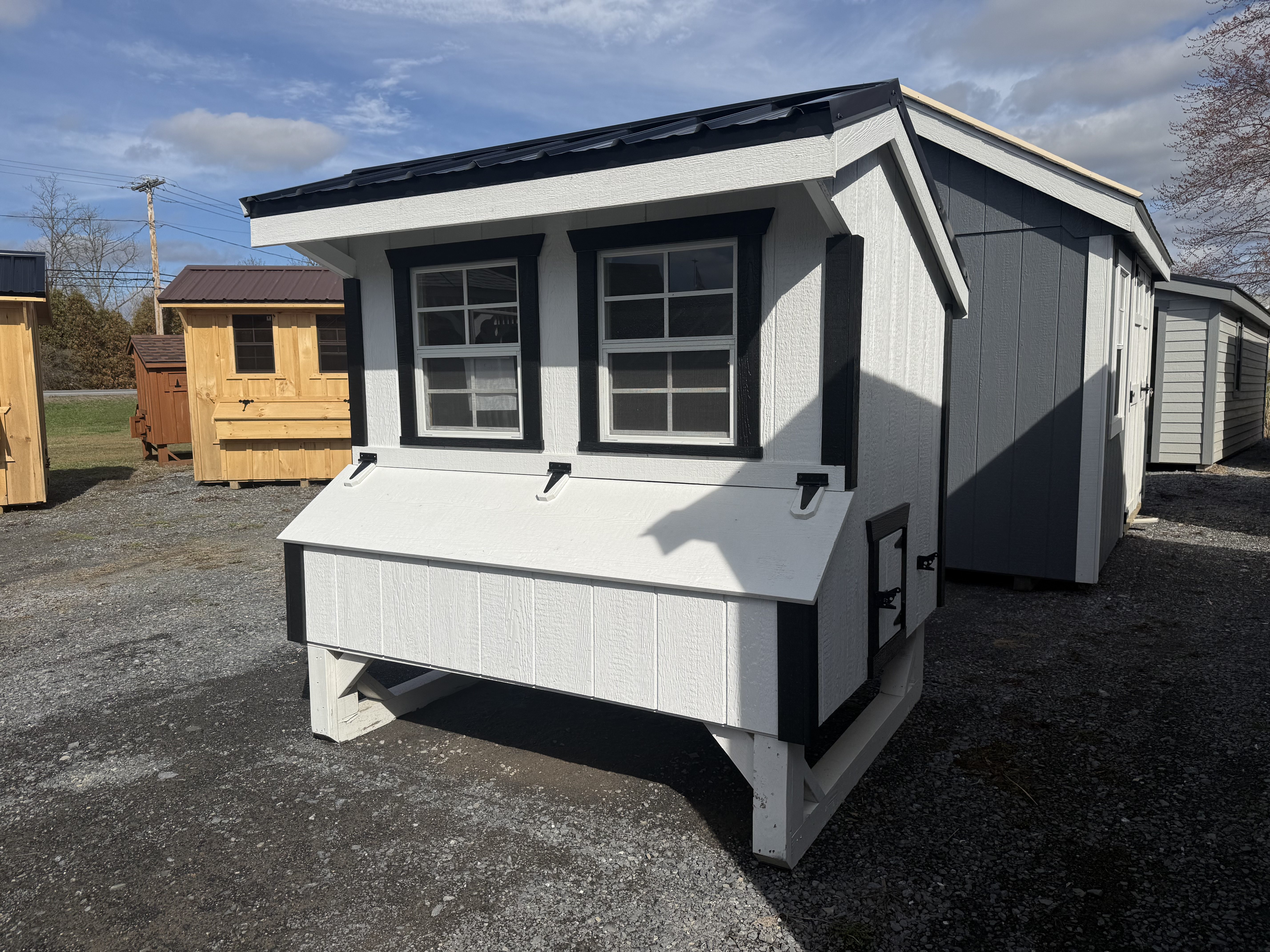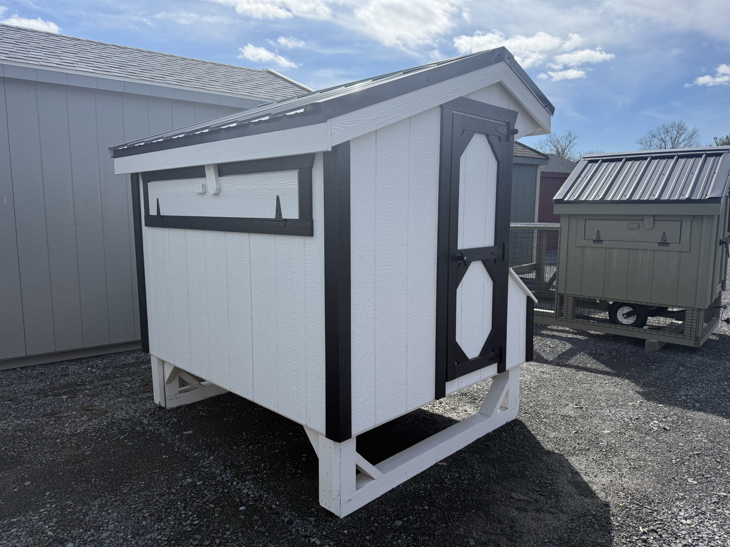 4'x6' chicken coop, 4 nesting boxes, epoxy floors, metal roof, two 24"x27" windows, entry door, chicken door w/ ramp, holds 10-12 chickens