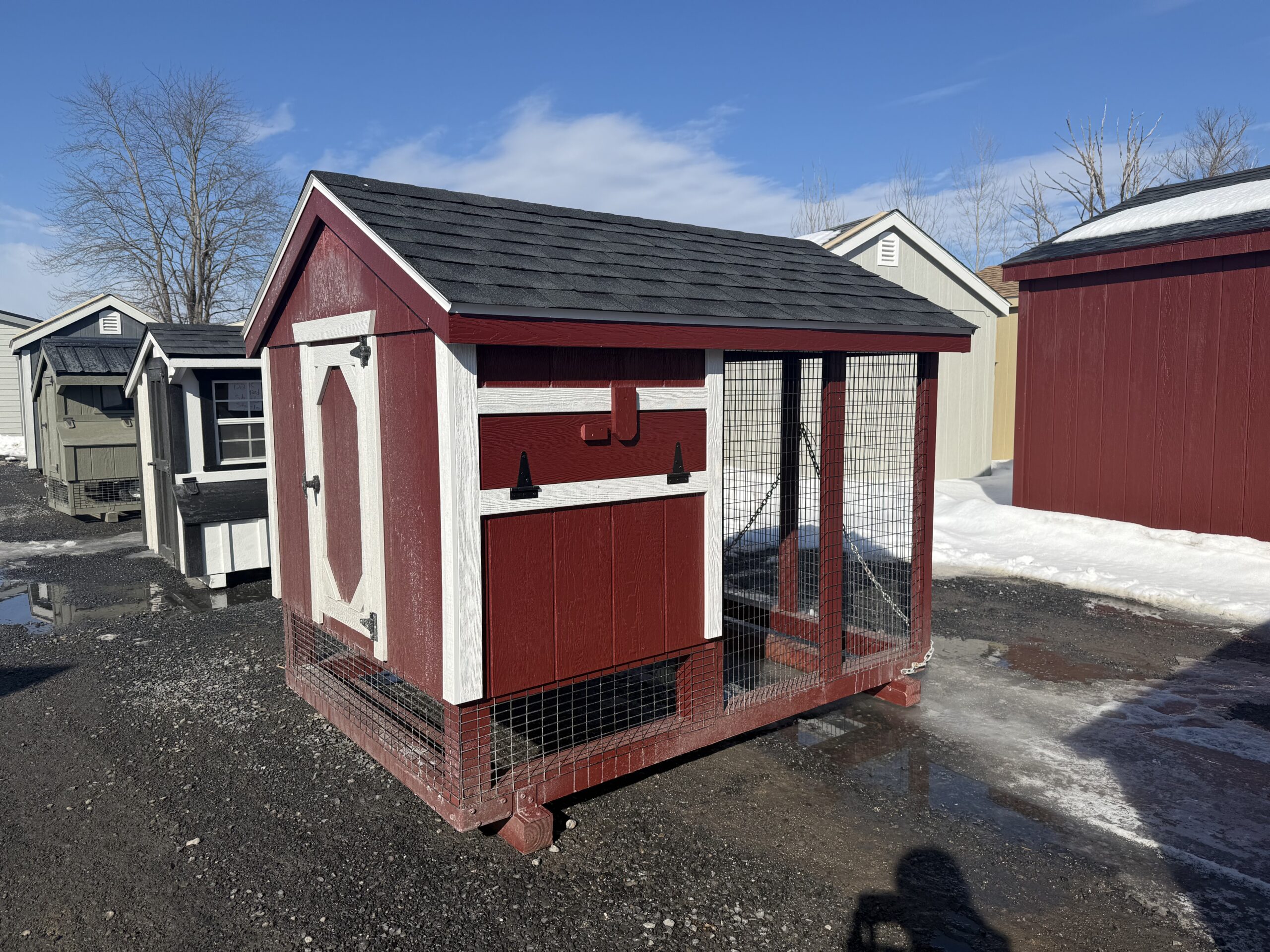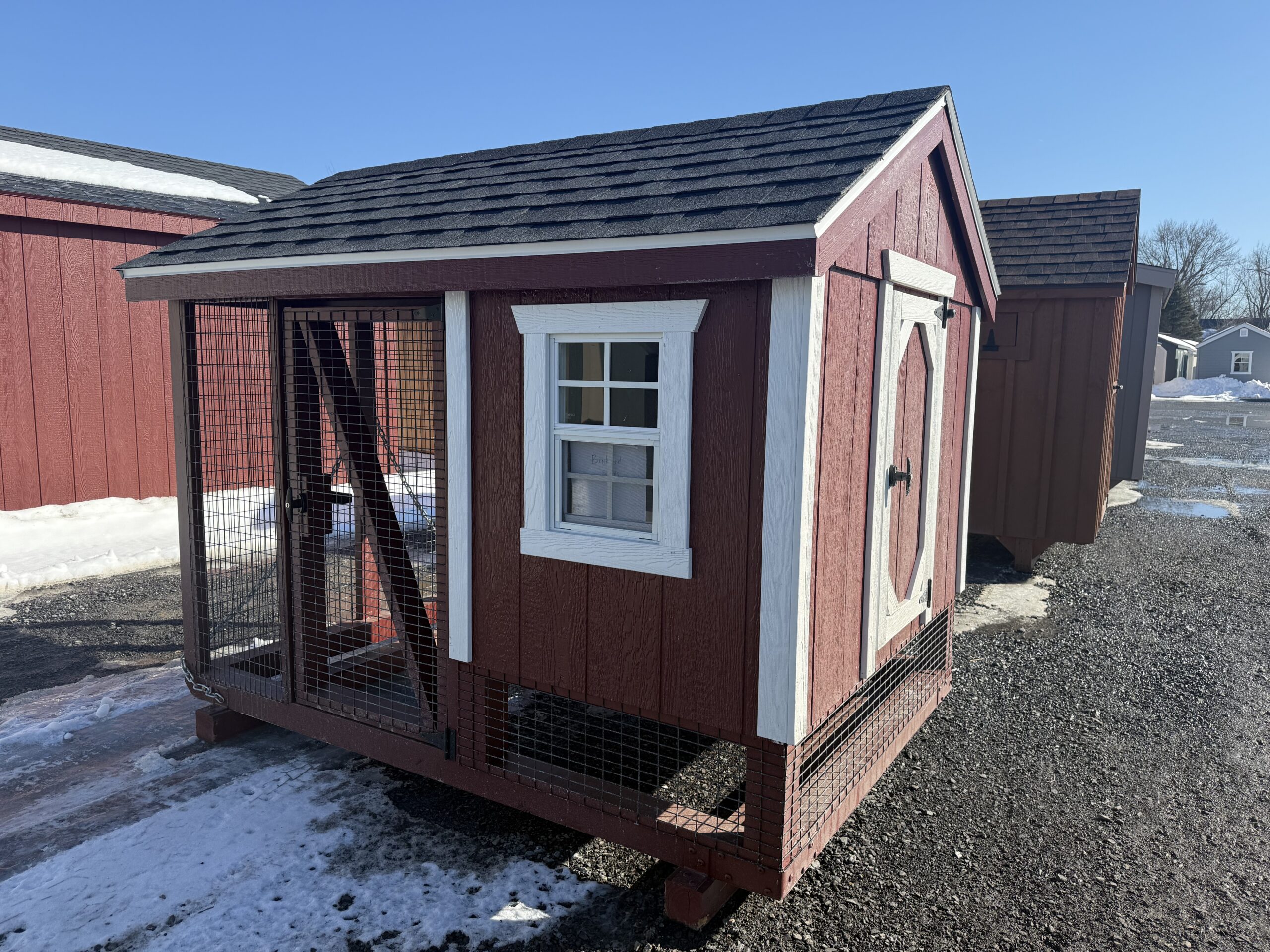 5'x7' chicken coop, 3'x5' coop area, 4'x5' run area, 3 nesting boxes, epoxy floors, one 12"x18" window, entry door, chicken door, holds 5 chickens