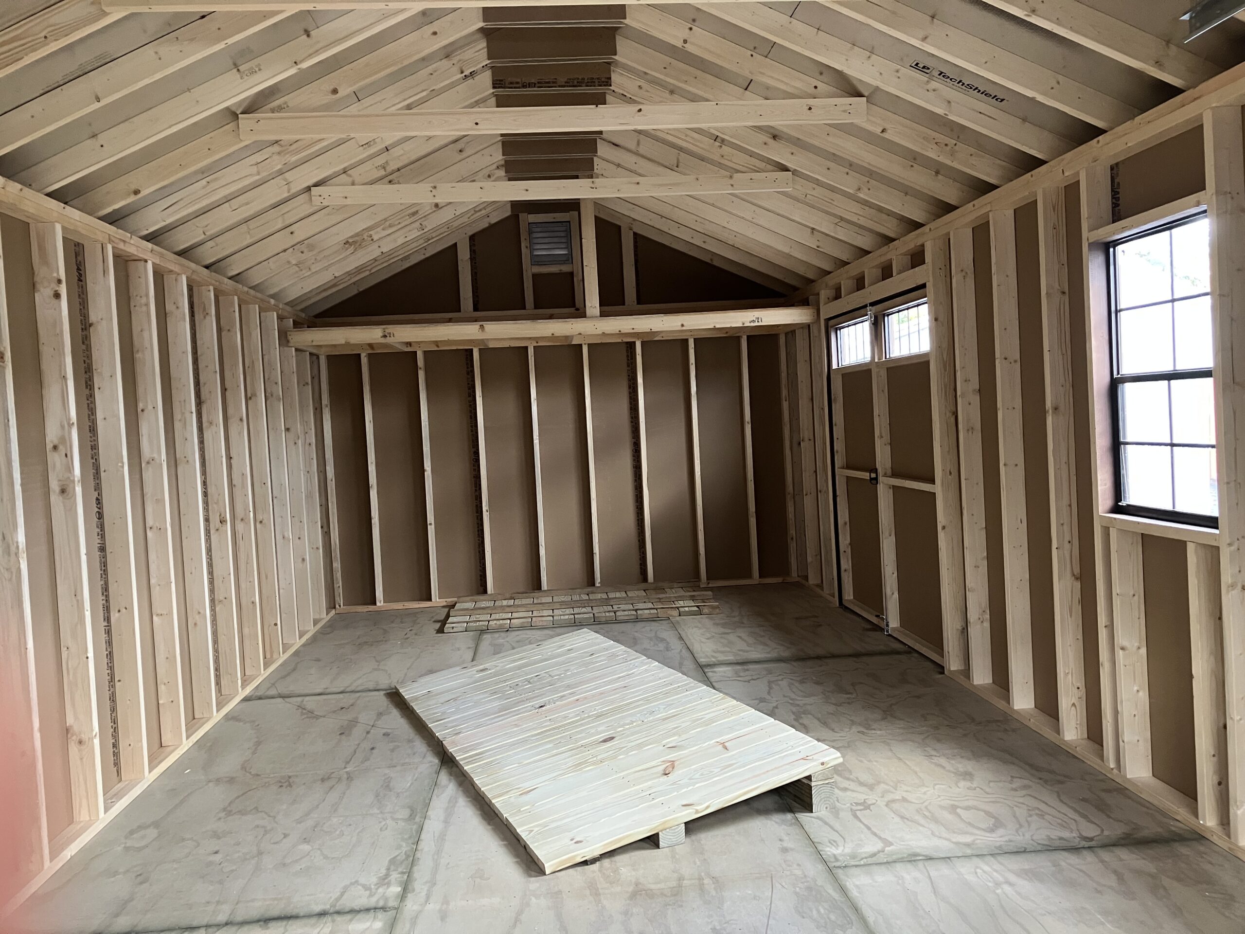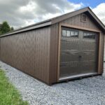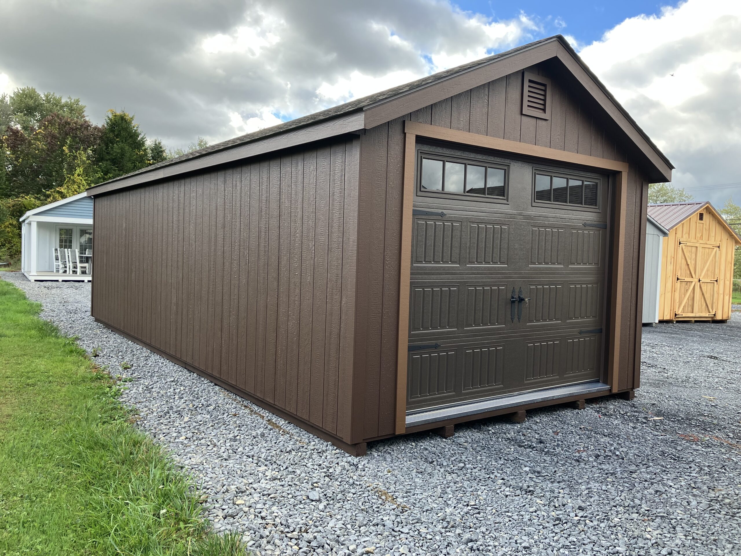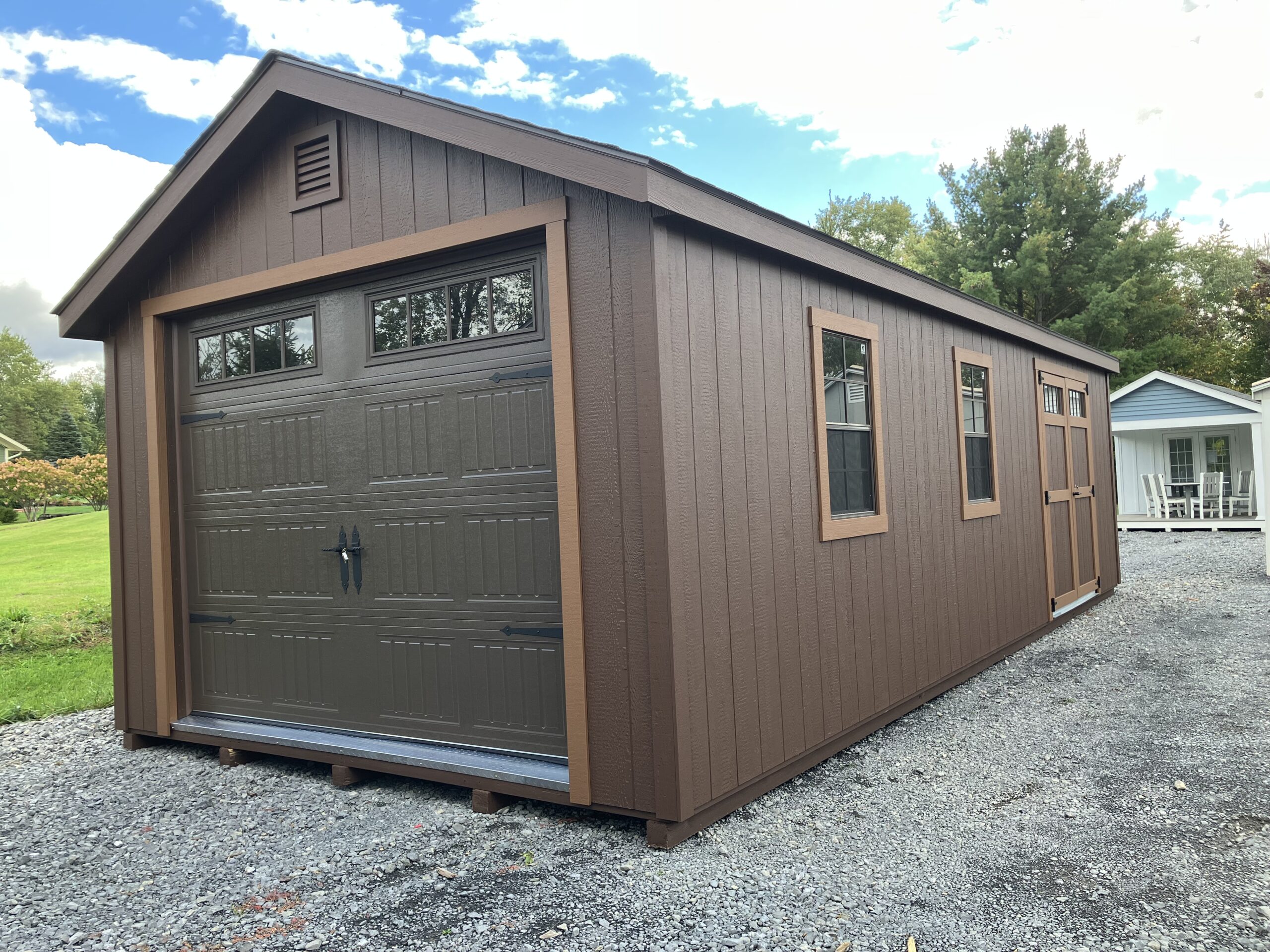 12x28 New England Preferred garage with 9x7 black carriage garage door with Stockbridge Long glass, diamond plate & P.T. ramp, 3' loft, 2-24"x36" windows, 36" entry door with transom glass, 10" gable overhang above garage door, full rake and fascia trim, 6/12 roof pitch, 3/4" pressure treated floor with P.T. floor joist 12" on center