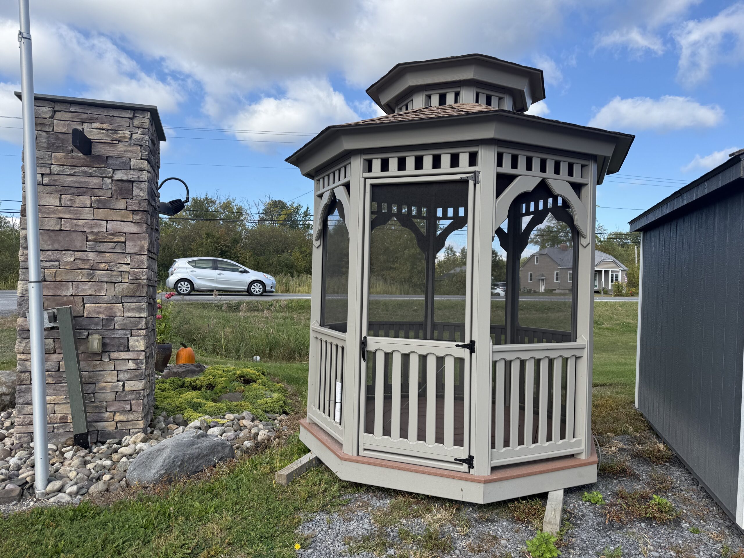 8' wood octagon gazebo, double roof, painted clay, screened sides & under flooring, redwood composite decking, natural teak stained ceiling electric package, cupola