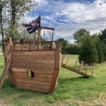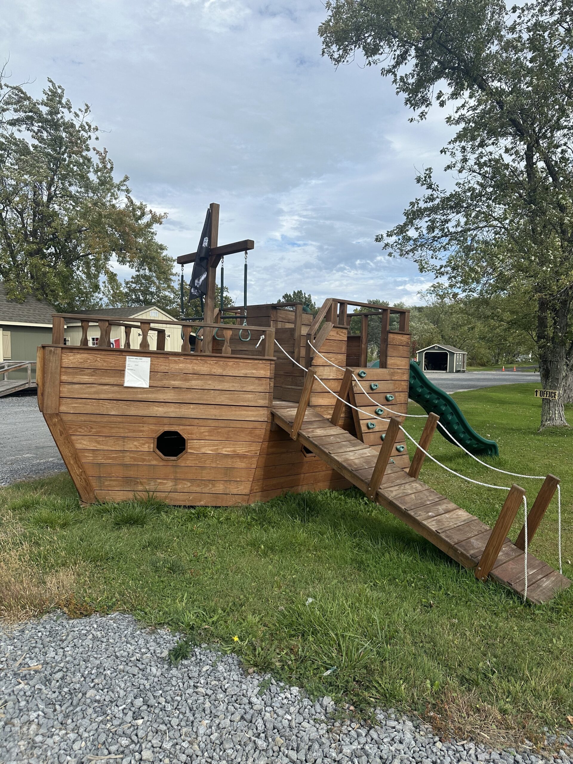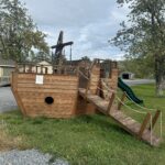 8x14 small boat, clear coat, green accessories, 10' slide, draw bridge, inside ladder, 2-trapeze bars, fireman`s pole, rock wall and 2 position swing arm
