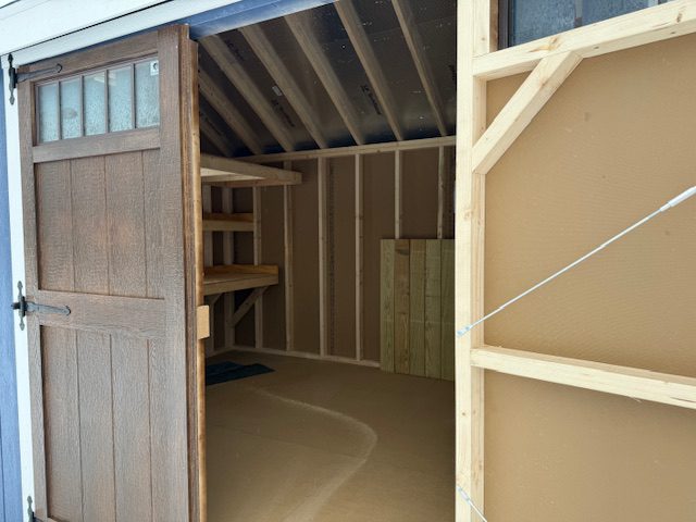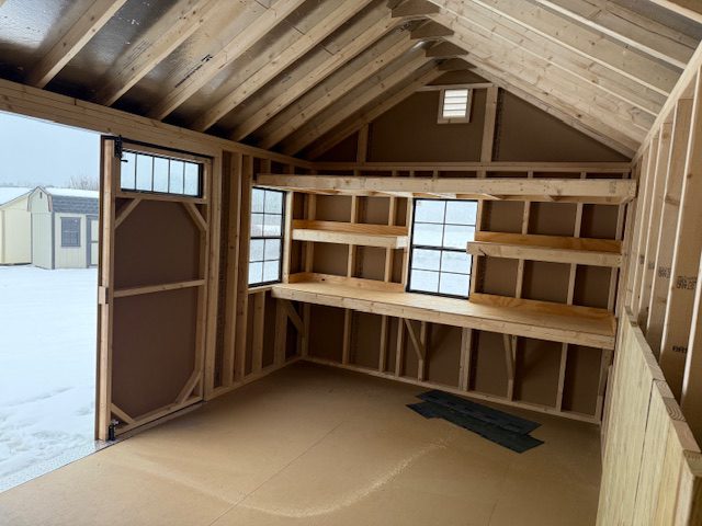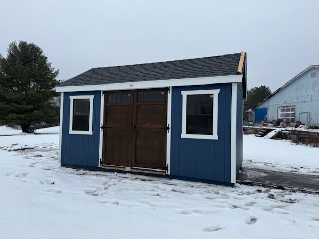 10x16 New England Cottage w/ 7' sidewalls, 6' double doors w/ transom glass and charcoal stain, diamond plate & P.T. ramp, workbench package with 3' loft, 3-24"x36" windows w/ screen, 2 gable air vents, steep roof pitch, 1"x6" miratec rake and face, 3.5" miratec trim, 5/8" PerformMax flooring