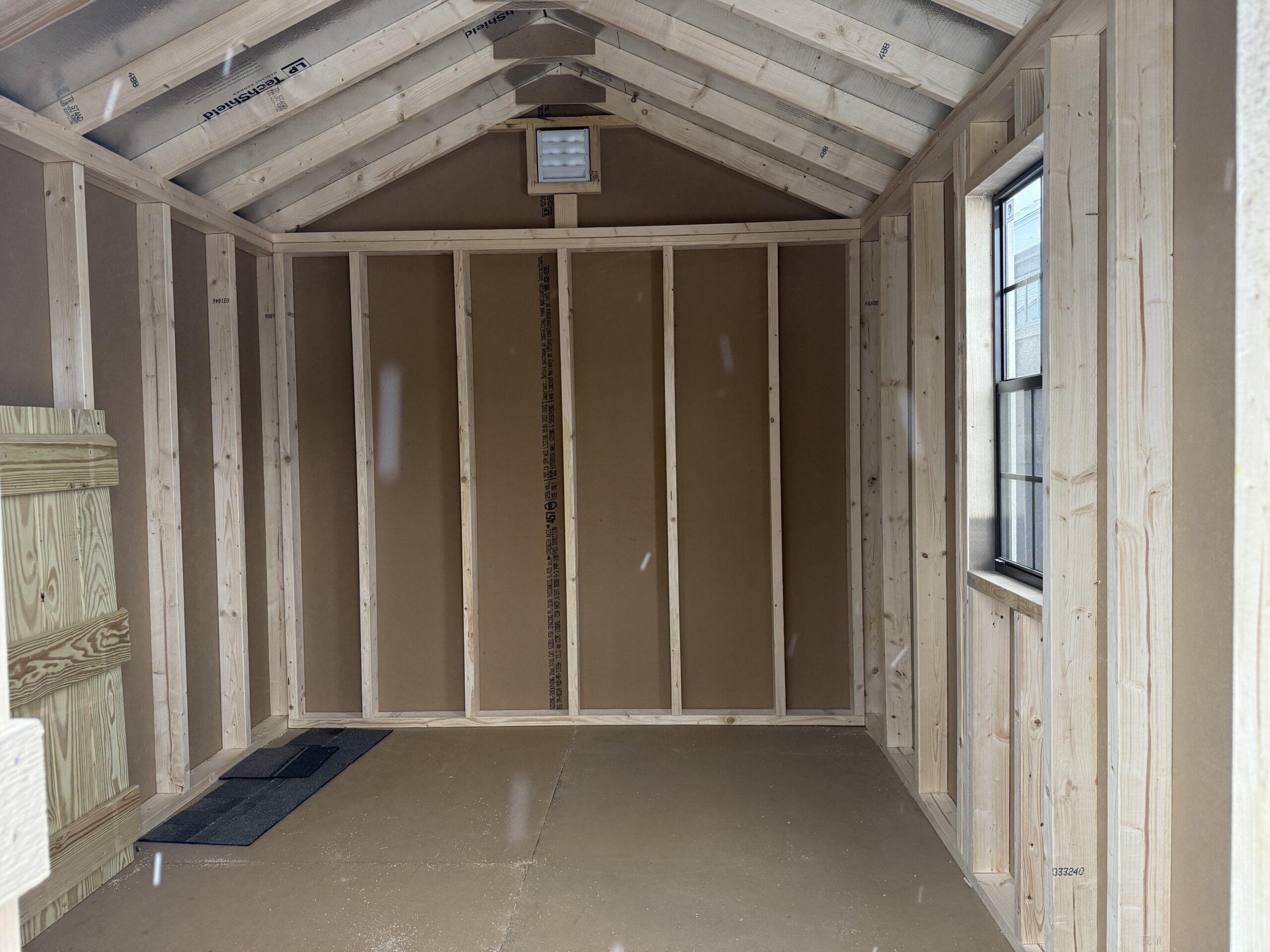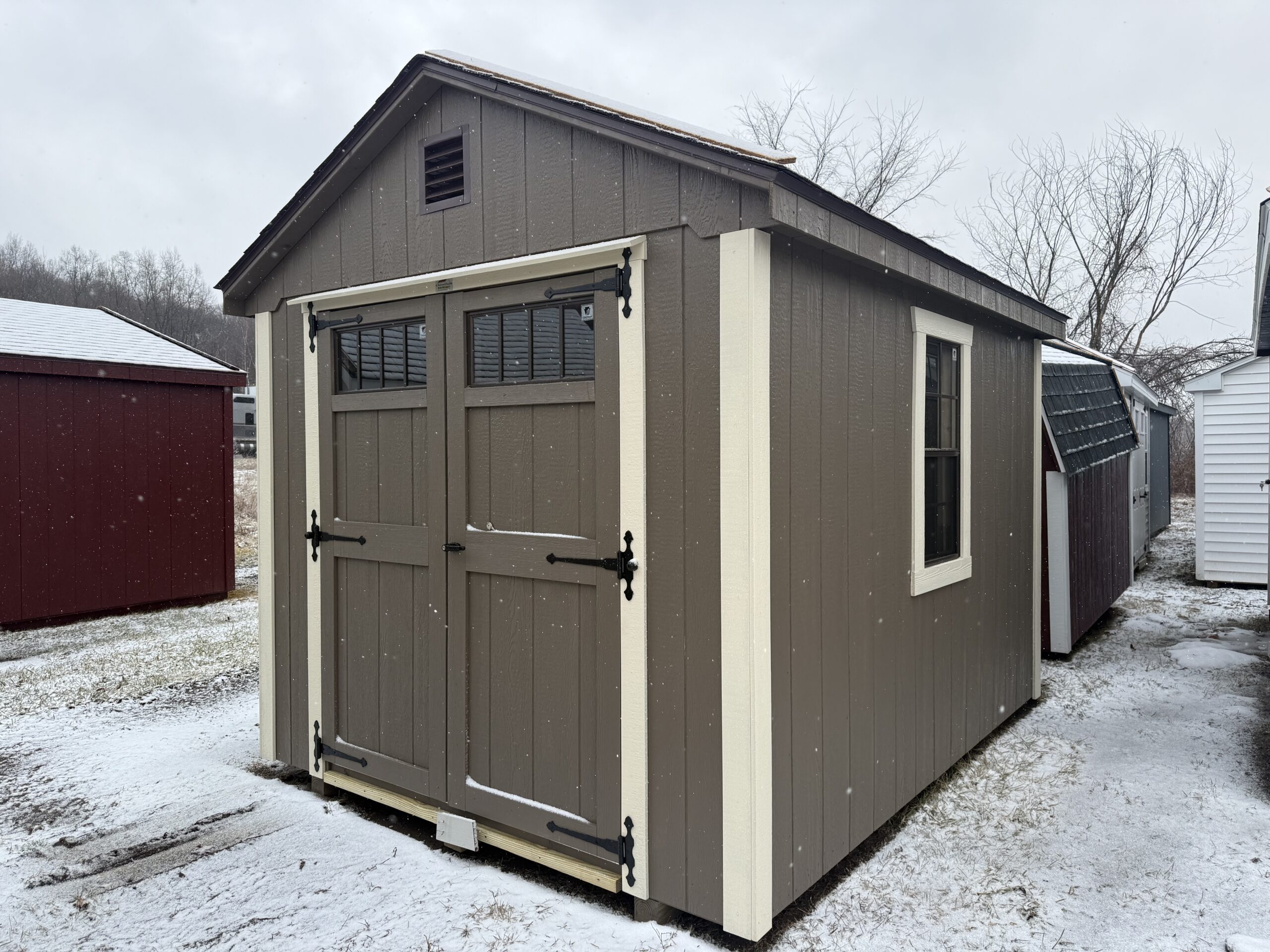 8x10 Cottage, 6'2" sidewall, 5' double door w/ transom glass, diamond plate & p.t. ramp, 1-18"x36" window w/ screen, gable air vents, 3.5" miratec trim, 5/8" T&G PerformMax flooring
