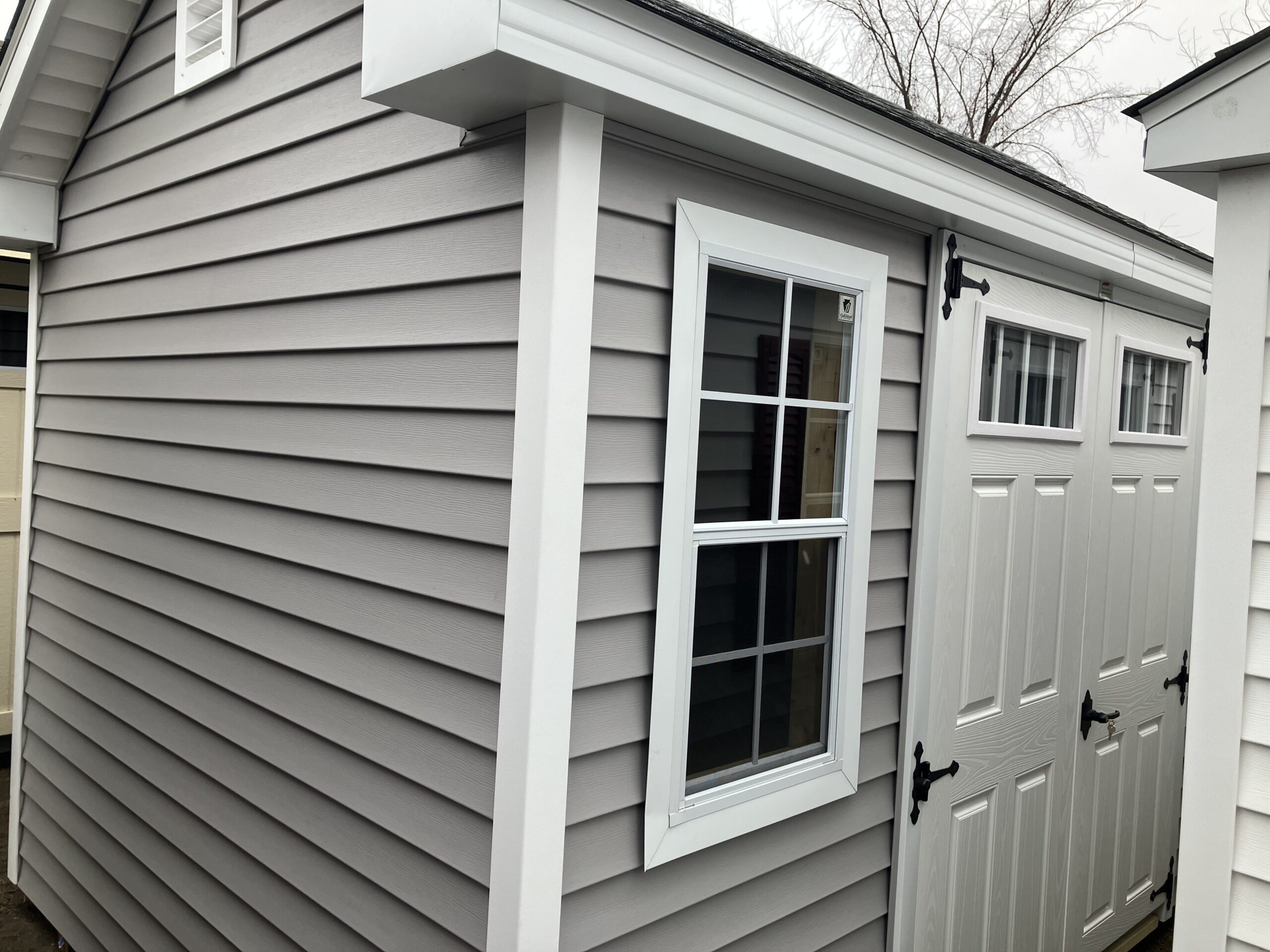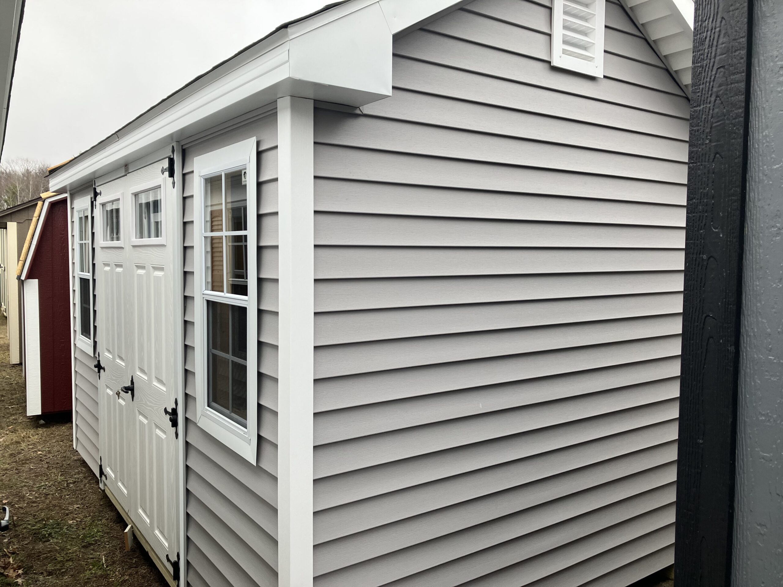 8'x12' Vinyl New England Cottage w/ 6'2" sidewalls, 5' double fiberglass doors w/ 4 lite glass, diamond plate & P.T. ramp, workbench package with 2' loft, 2-24"x36" windows w/ screen, 2 gable air vents, 2 - 8" gable overhangs, steep roof pitch, full rake and fascia trim, 5/8" PerformMax flooring