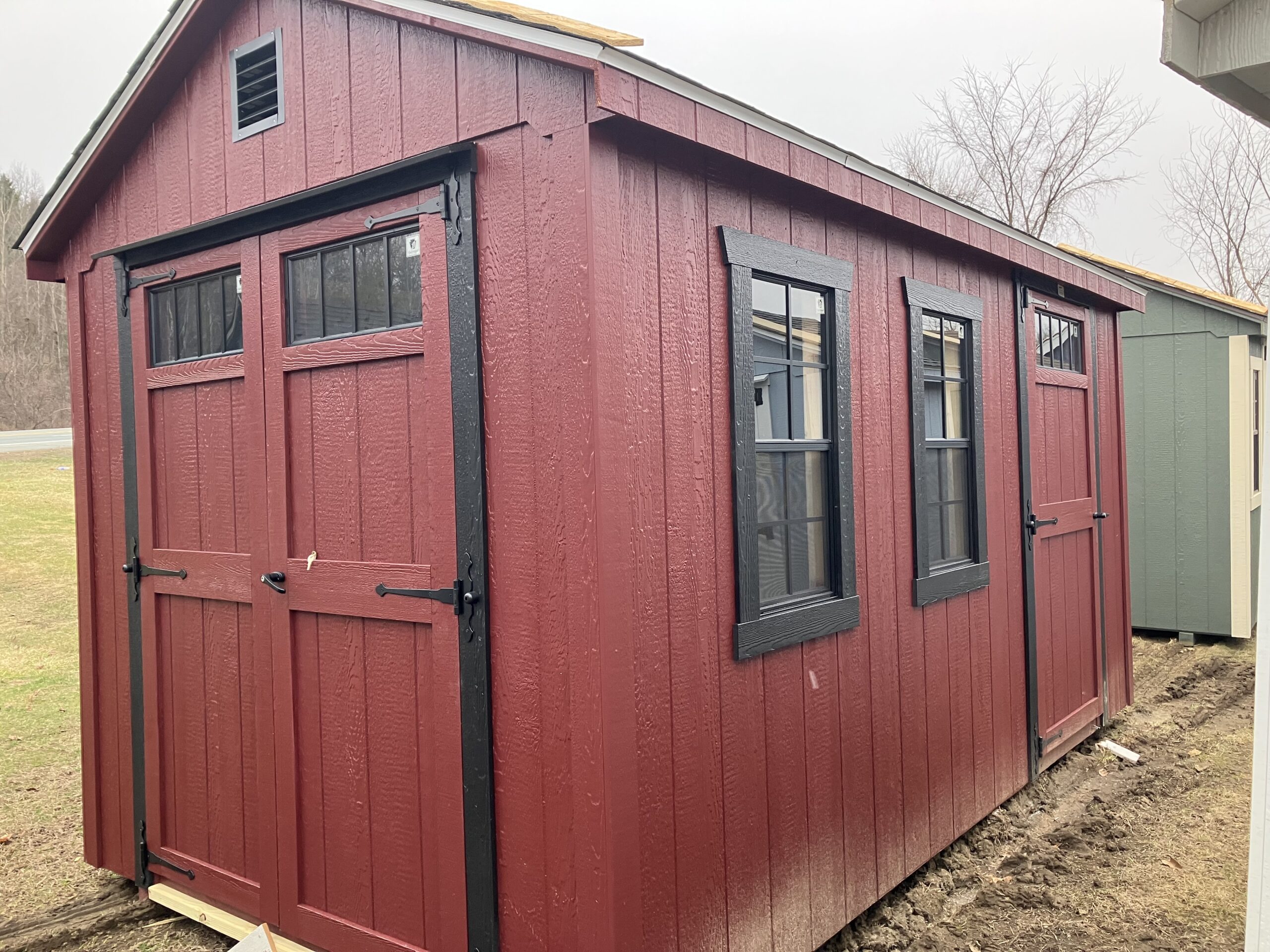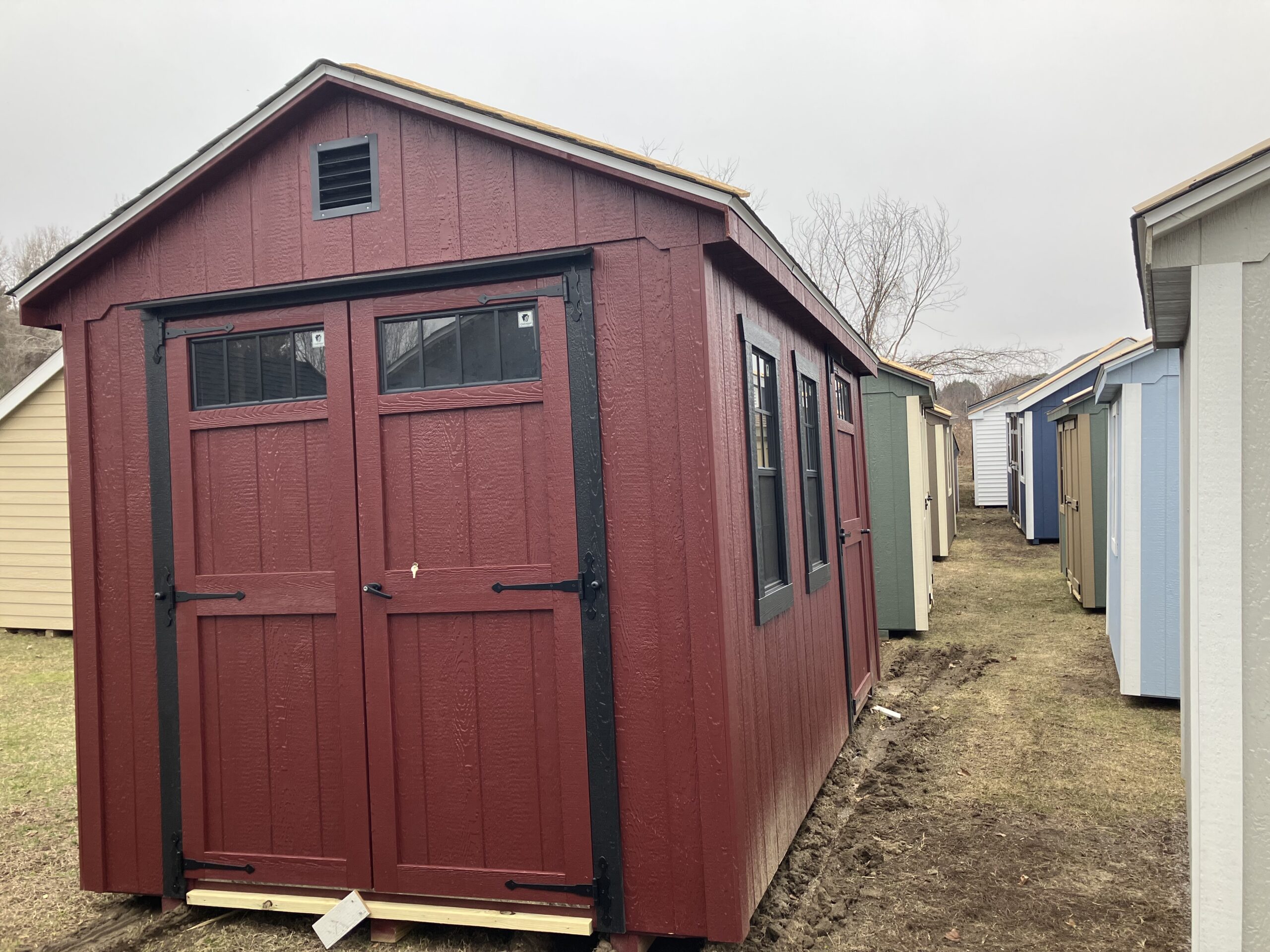 8' x 14' Smartside 7' Cottage, 5' wide double doors and 3' entry door with transom, diamond plate and pressure treated ramp, 3' loft, 2 - 18"x36" windows w/ screens, 2 gable air vents, 3.5" miratec trim, 5/8" T&G PerformMax flooring