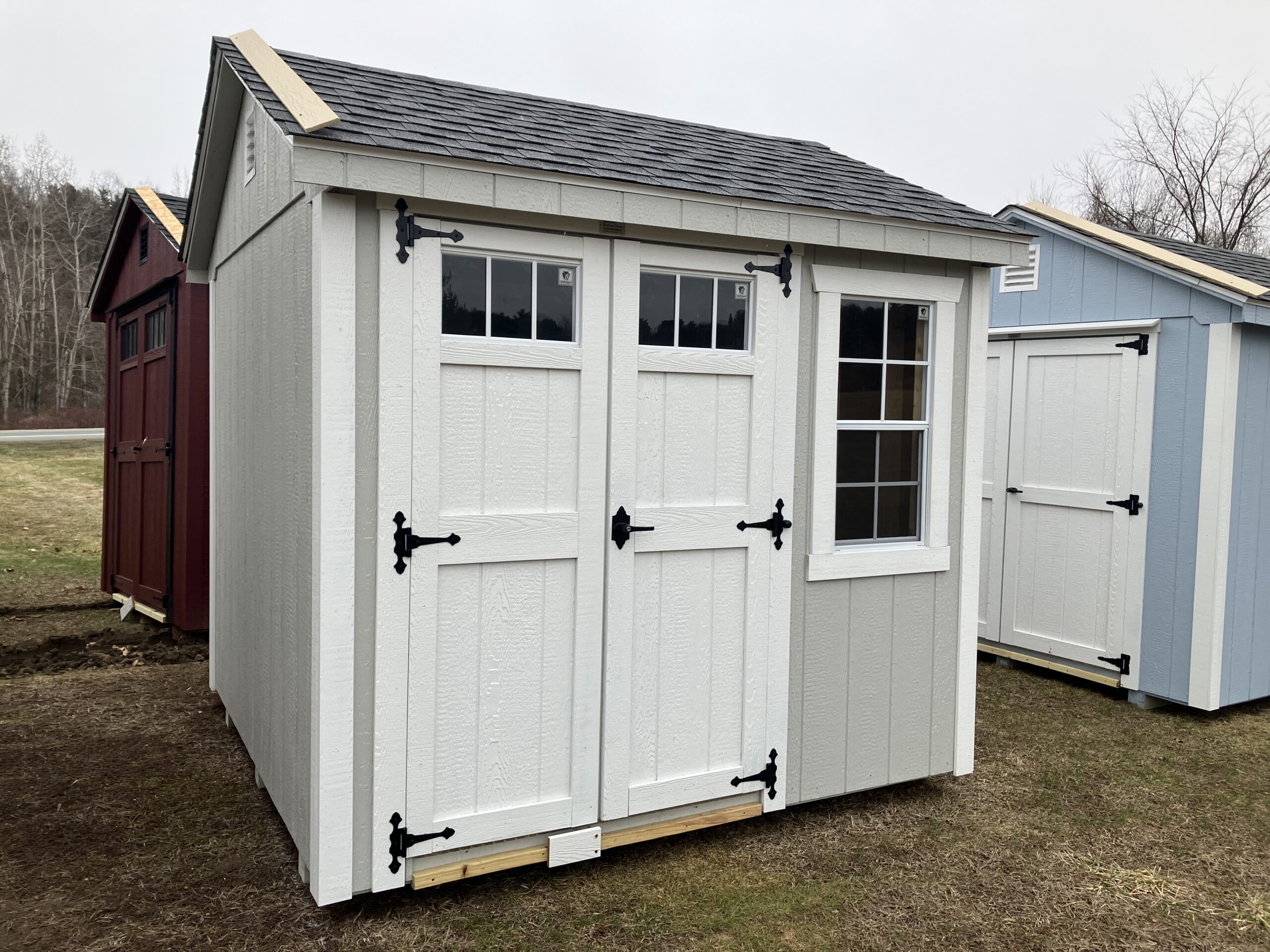 8x8 cottage w/ 6'2" sidewalls, 4' double door w/ transom glass, diamond plate & p.t. ramp, 1-18"x36" window w/ screen, gable air vents, 3.5" mitatec trim, 5/8" T&G PerformMax flooring