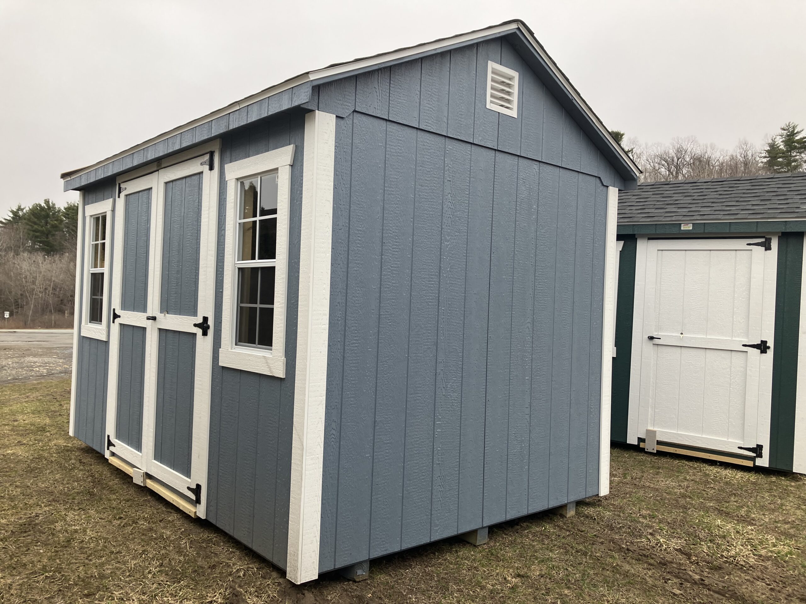 8' x 12' Smartside, 7' sidewalls, 6' double doors, diamond plate and p.t. ramp, workbench package with 2' loft, 2 - 18"x36" windows w/ screens, 2 gable air vents, 3.5" miratec trim, 5/8" T&G PerformMax flooring