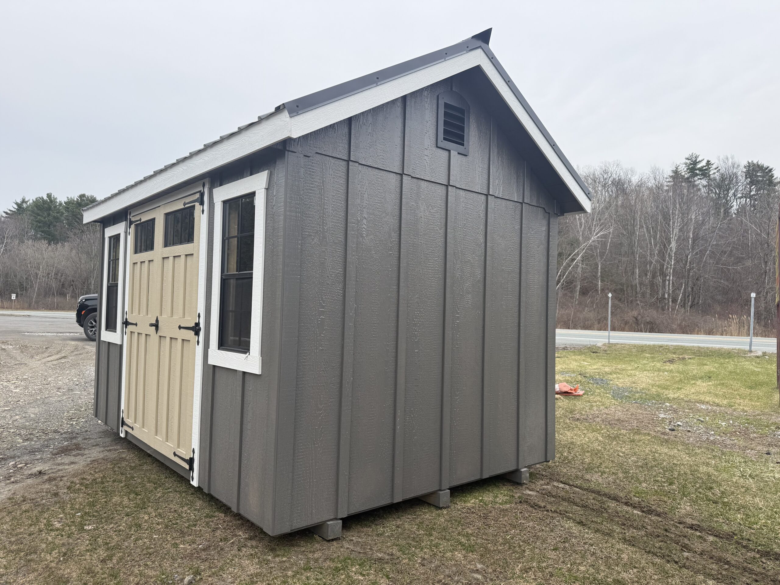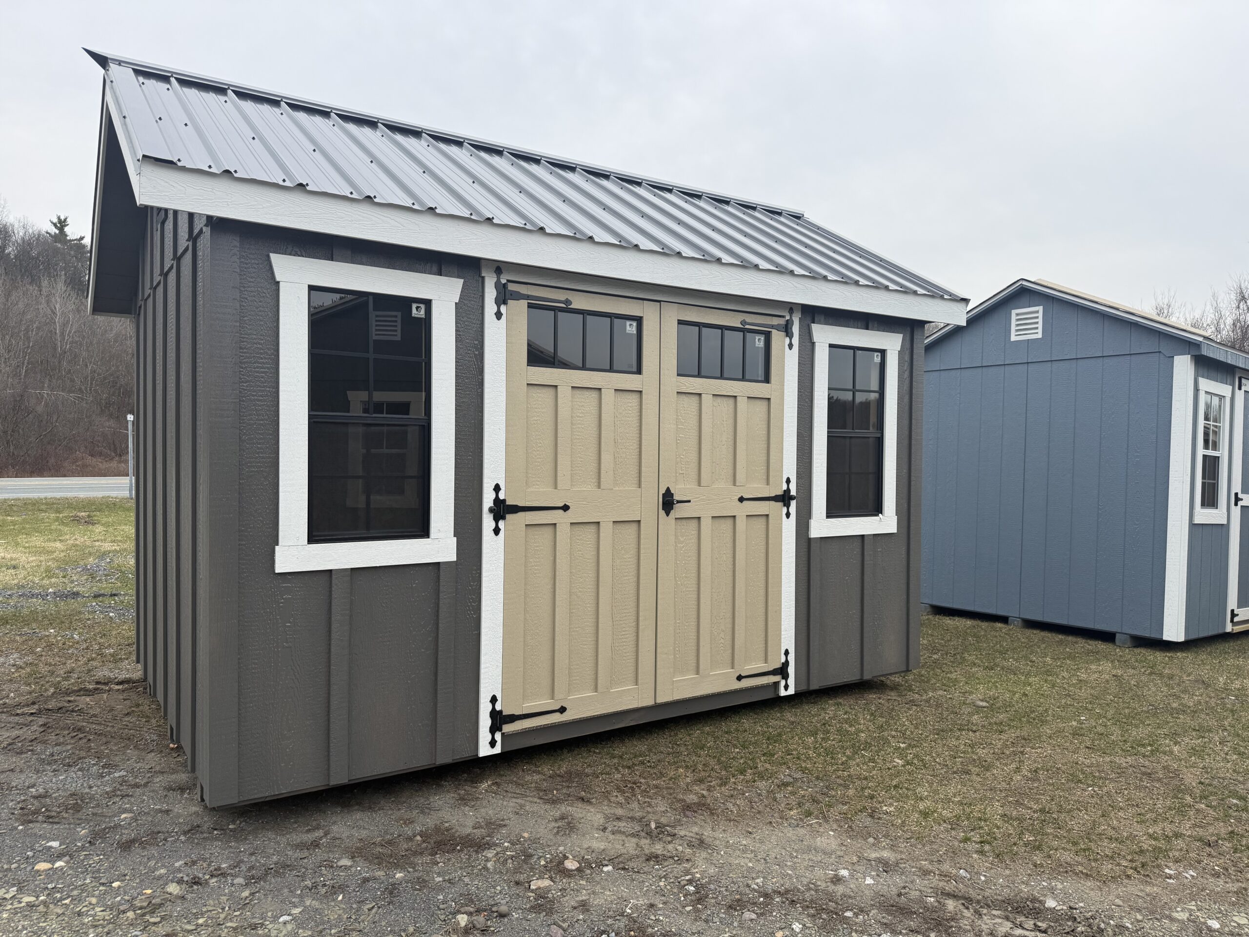 8'x12' Cottage, Smartside Board & Batten siding, 6'2" sidewalls, 5' double door w/ transom glass, diamond plate & p.t. ramp, 2-18"x36" window w/ screen, gable air vents, 3.5" miratec trim, 5/8" T&G PerformMax flooring, full rake and fascia trim, 8" gable overhangs